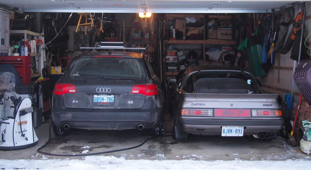 Like most people, my garage is so crammed with sh .... stuff that I only have room for the Rx7. It snowed for the first time yesterday here in Toronto so I thought its time to put the Audi in the garage too. I moved my '68 BMW bike out and really reorganized everything until room could be made. After I parked the Audi I was quite shocked how diminutive the Rx7 is compared to a current car. The Audi looks so tall and ungainly in comparison even though it isn't, actually quite beautifully proportioned when viewed by itself. The Rx7 is also surprisingly wide, as wide as the 5 passenger wagon. The Audi is some 3 feet longer than the Rx7 but that's to be expected.