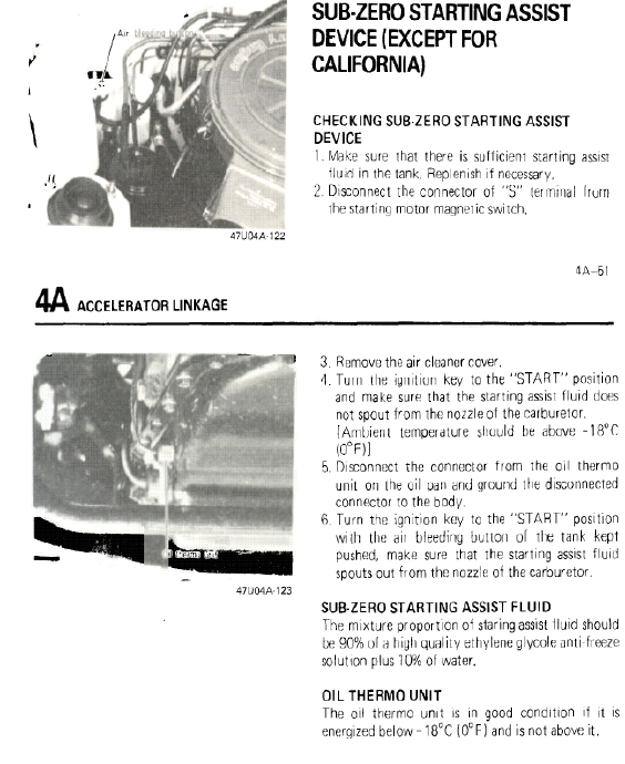 the sub zero starting assist was instaled on all non CA spec 7's. it's job was to inject a 10% water/90% antifreeze mix into the intake manifold for de-icing purposes when oil temps were below 32 degrees farenheit. the oil thermo unit in the oil pan sent the signal for the sub zero starting assist to trigger into action. kind of a neat little system. i always keep mine installed.