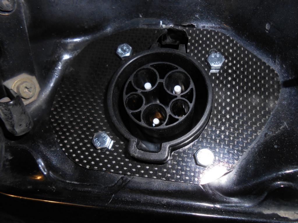 On the GSL-EV I worked on fitting the charge plug under the gas cover. Here is what it will mostly look like. This was just to check the fit of everything. I have some bare metal so I need to paint it before I put everything in permanently. I think it will turn out pretty well.