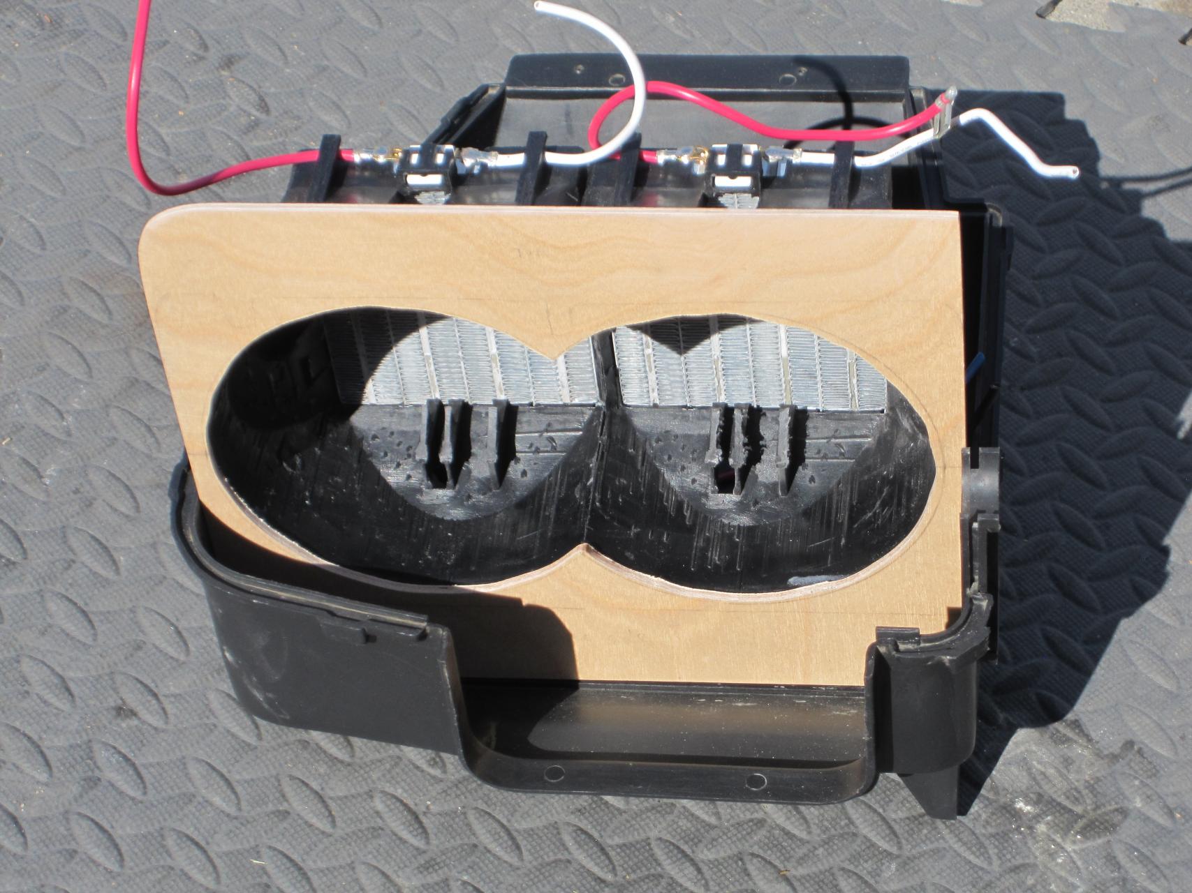 Mentioned adding the heater to my FB to EV conversion. Since the actual heater box is a little small for what I want to do I decided to re-purpose the AC evaporator box. The first photo is the AC evaporator box. The second photo is of the 85 GSL evaporator assembly. It is about 9x8x8 inches. I had never seen one so I thought a photo might interest others. The third photo is of the pair of ceramic heater elements from a couple of $15 space heaters from a discount store. I elected to keep the high temperature plastic to hold the elements, just removing the motors/fans and trimming the housings so the elements are adjacent. I will paint the 1/8" plywood plate to seal the wood and seal the air gaps with high temp silicone gasket material (650 degree F). The last photo shows the assembly sitting in the evaporator enclosure. I need to come up with some way to mount the plywood plate in the enclosure and then fabricate some control electronics to turn it on and off. I've been thinking of doing a quick and dirty PWM and replacing the temperature control with a pot that will control the PWM. I believe the temperature control just changes the amount of hot water that is allowed to flow through the heater core. This may not be necessary and I am hoping it won't be. More updates later. For those who are curious the ceramic cores are a positive temperature coefficient device that when cold draws about 16 amps from a 120vac outlet when first turned on and drops to 10 amps within a few seconds. I expect to see a higher initial current because my battery voltage is 175 volts right off the charge and since I have two elements it should drop off to around 20 amps total giving me about 3500 watts of heat which is about 12000 BTU. This may be excessive and I will have to keep an eye on it. There is an overtemp sensor adjacent to each element which I will use to break the current. Hopefully this happens before the enclosure melts. More later.