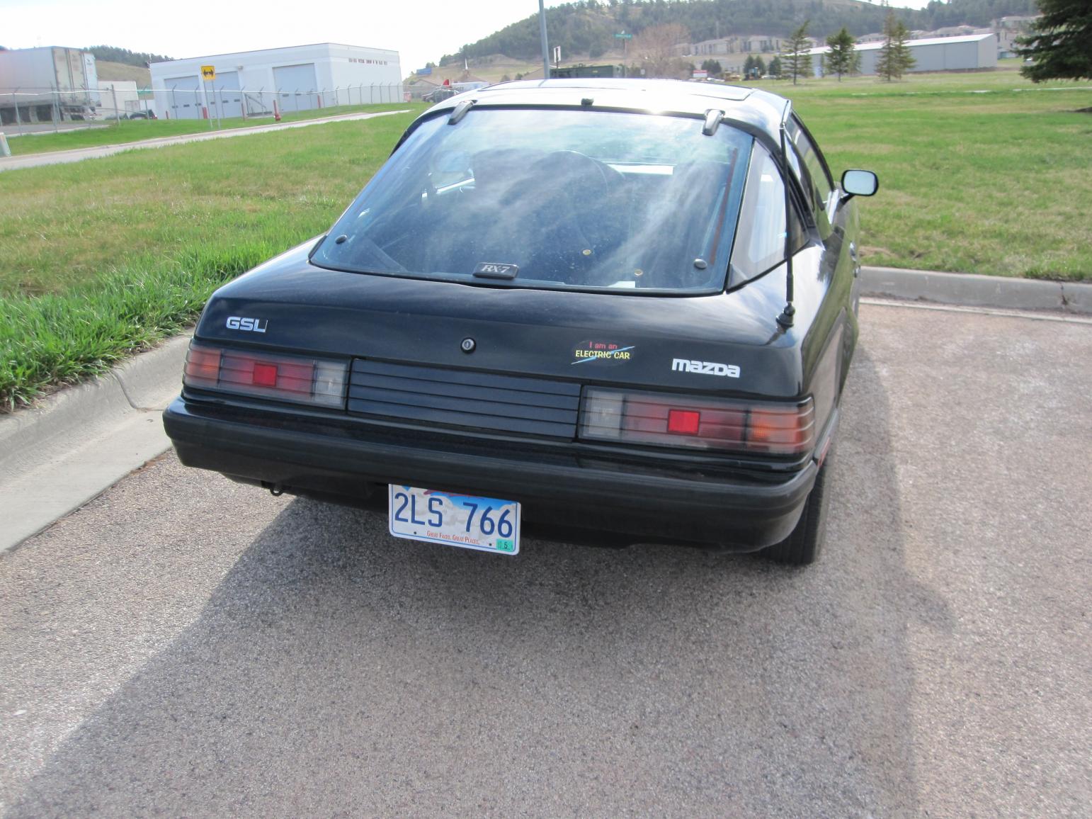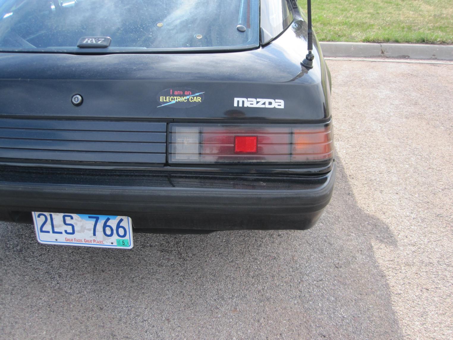 Mounted the Mazda badge I made on the GSL-EV yesterday evening. Here is what it looks like finally mounted on the car. I am pleased with the way it came out. I washed it last weekend but we have a cement plant in town and it rained just a little a couple of days ago. An observant viewer will notice the lack of exhaust pipes and the yellowing epoxy plugs in the rear hatch glass where the wiper motor was mounted.