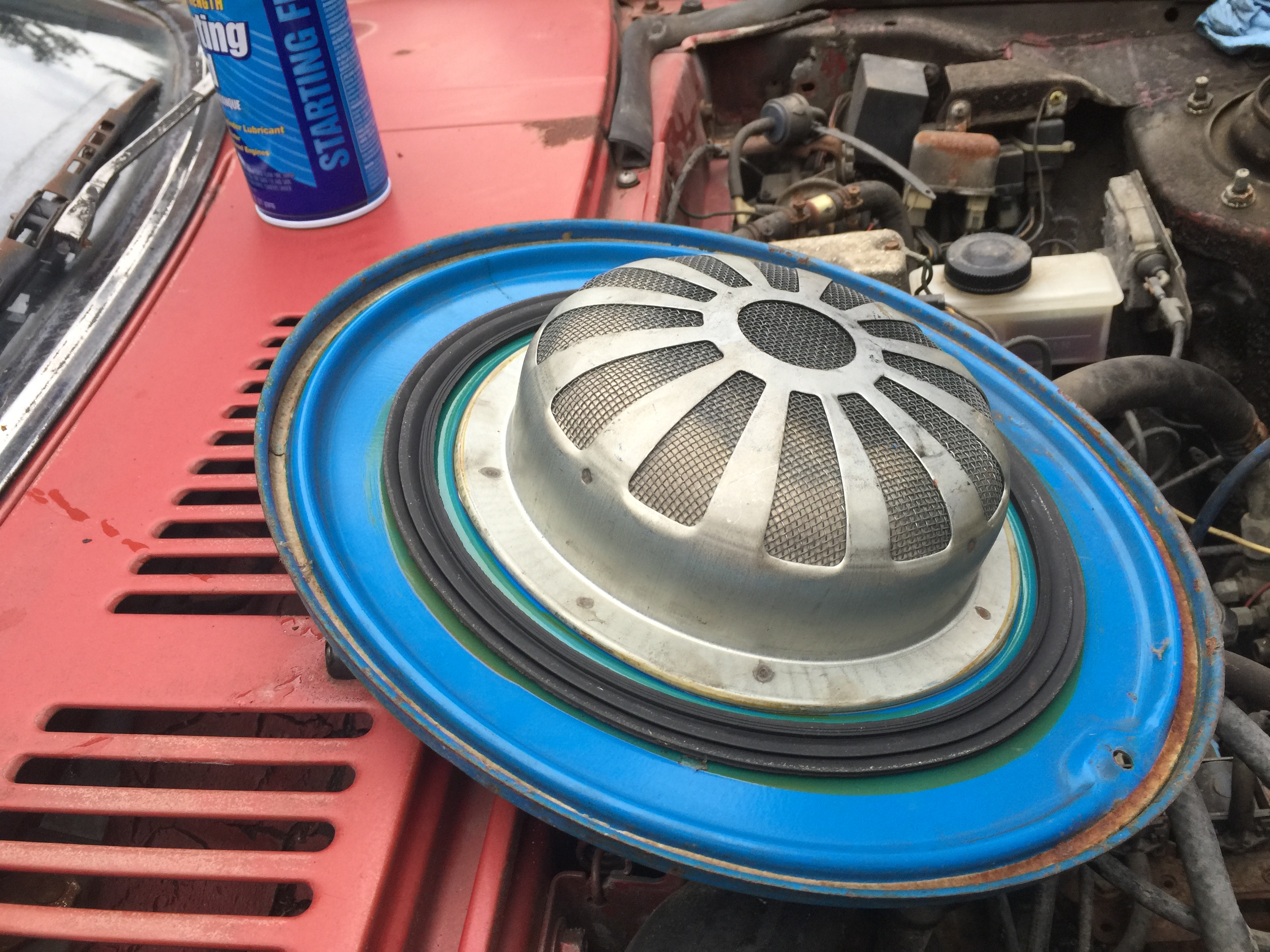 Kinda thinking about deleting the rest of the emissions since the air pump is gone , but I wanna get this running first before messing with it . Used some masterseries rust remover / metal prep and got the peripherals looking nice and rust free but also took anodization off. A reasonable trade off.
