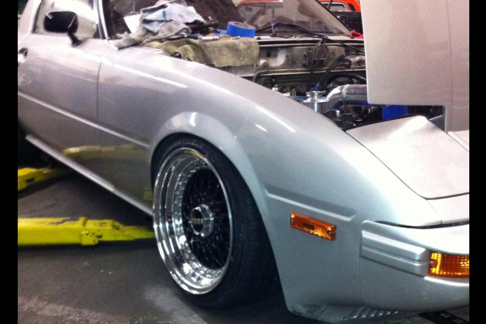 Where should I start because my FB got almost everything brand new... A 13B Halfbridge port with a Comp Turbo GT35R Triple ball bearing, V-Mount Intercooler with a 3" pipe all the way around including an exhaust pipe, Water/Methanol injection, a set of Cabeau Seats, Auto Power 6 points Rollbar, Tokico Illumina Shocks, Energy suspension Polyurethene bushing and everything else, front and rear big brake turbo ll kit with drilled rotors, 5x114.3 bolt pattern, new H/D rear axle, GSL LSD rearend, Ground Control and RE Speed fully adjustable front and rear coilover type, Microtech with a dash unit, AEM Tru-Boost Control and wide band gauges, BBS RS Wheels 16x8.5 on 205/40 2.5 inch lips and 16x10 on 245/40 3.5 inch lips, front spoiler and a wrapped around rear spoiler. She is also getting a new paint job (still gonna be silver as a factory paint. It should be completed soon. All work done by Juni of JRX Rotary.