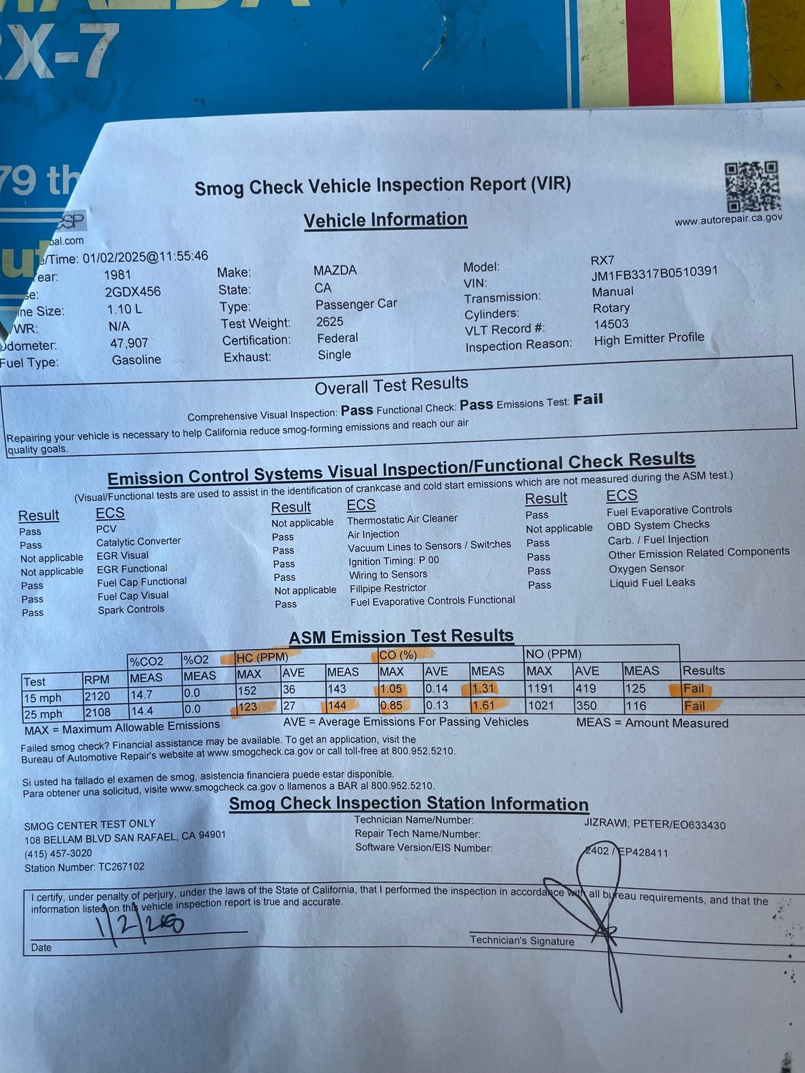 Probably more detail than someone experienced like Holdfast needs... but thought may be useful for someone new to RX7 trying to pass smog.