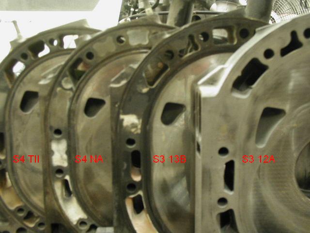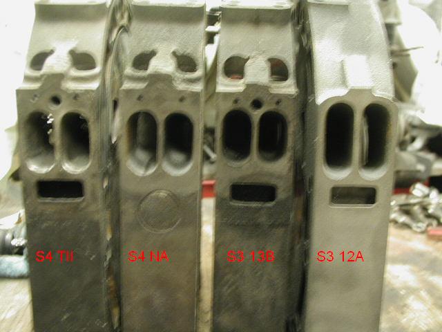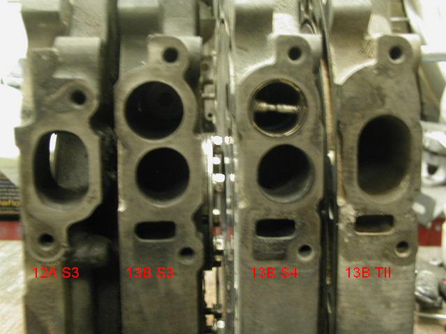 OK, finally pics. Some are a bit fuzzy, didn't steady the camera enough. A few notes. I'm suprised how big the 12A pimary ports are, intake and rotor side, compared to the others. The NA S3/4's have the same size 6th port sleeve, but on the rotor side you can see the S3 port opening is a little shorter than the S4. Width is about the same, the depth of the pic makes them appear different. Same with the TII secondary port, it is bigger than the 12A.