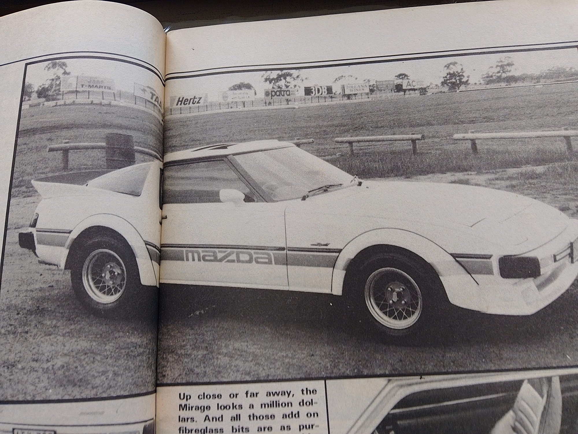 The prototype Mazda RX7 Mirage built by Penfold Mazda in Melbourne. I understand Mazda used the bodykit from the prototype for the 25 Mazda RX7 Mirages which formed the genesis of the Moffat RX7 race team. The aggressive front air dam is the best of the after market kits I have seen. I know it fits on the Series 2 as Mazda Australia had two Series 2 cars fitted out like the Moffat Race Team as publicity vehicles and one (if not both) had this air dam.