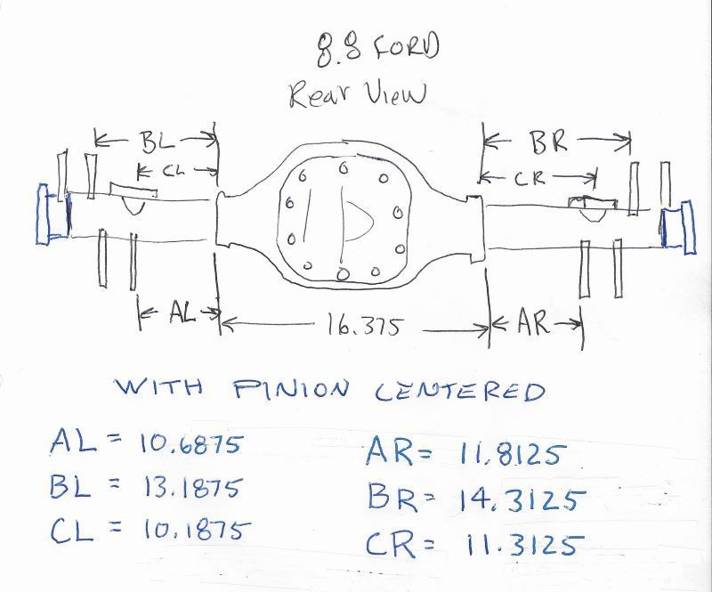 Note that with equal length axles/tubes, the 8.8 pinion will be offset appx 1/2" to 9/16" to the right. Exact pinion offset will vary a bit due to variances in carrier bearing shim thickness.