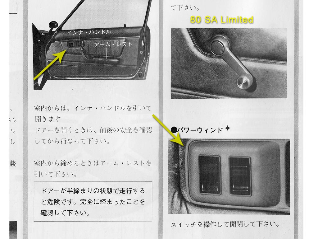 1980 SA SE Limited came with Power Windows (and leather, and rear wiper!). The only SA to be so-equipped. Excerpt from the JDM owner's manual I happen to, er, have handy. Note the OEM rockers were mounted in the driver's DOOR ahead of the door release. Passenger had a single in the same place.
