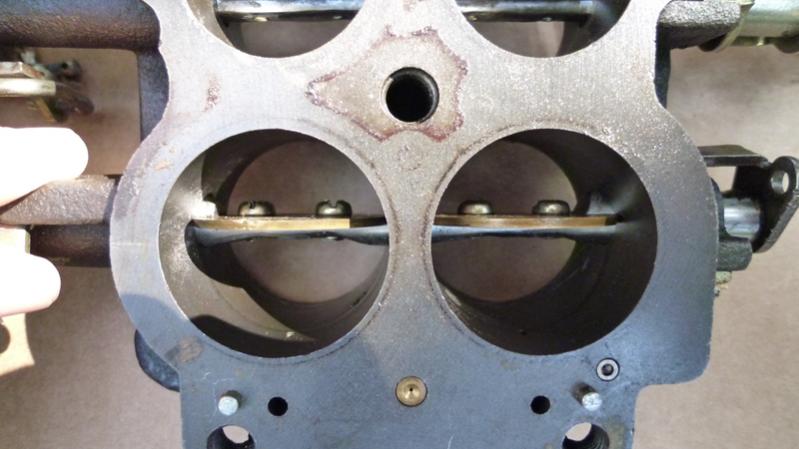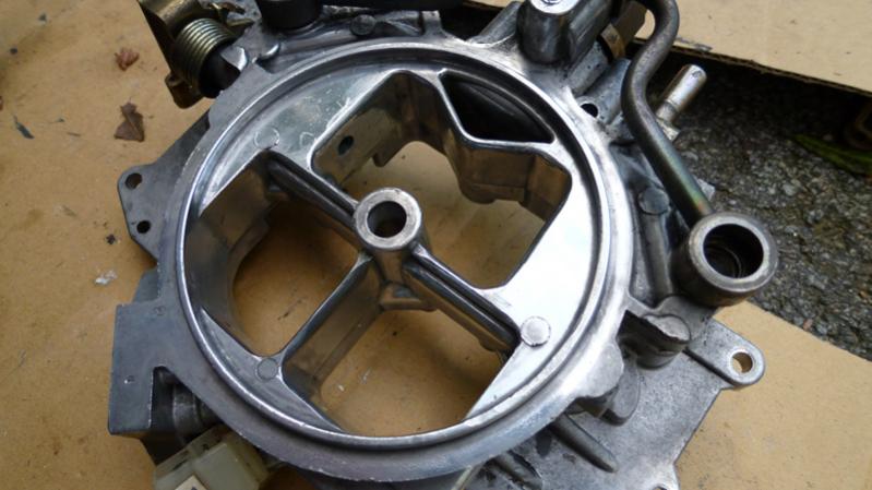 Here's a top down shot showing a much more flow friendly setup. The inner venturi arms were trimmed off completely, while the outer ones containing the fuel tubes were ground into an airfoil shape and polished. Be careful not to grind too far into the inner arms or you could cut right into the fuel tubes. The inlet of both main venturis was widened, and the secondary venturi diameter was bored out about 1mm. All booster and main venturis were polished. The oil metering tubes were also removed. Note that the bottom throttle body section was left off for this shot: