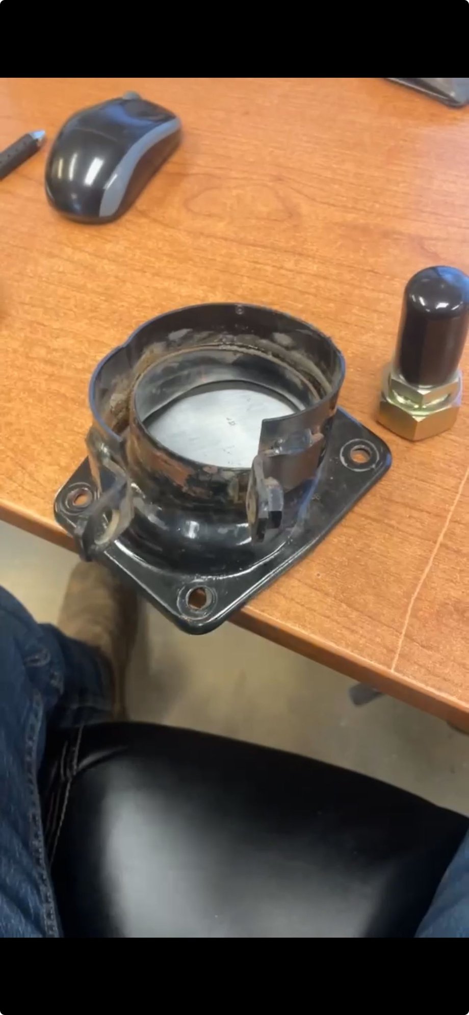 Non PS has a flat bracket and rubber grommet. PS has a plate (pictured on desk) which clamps the piece in that necks down and clamps the lower half of the PS column (circled in red).