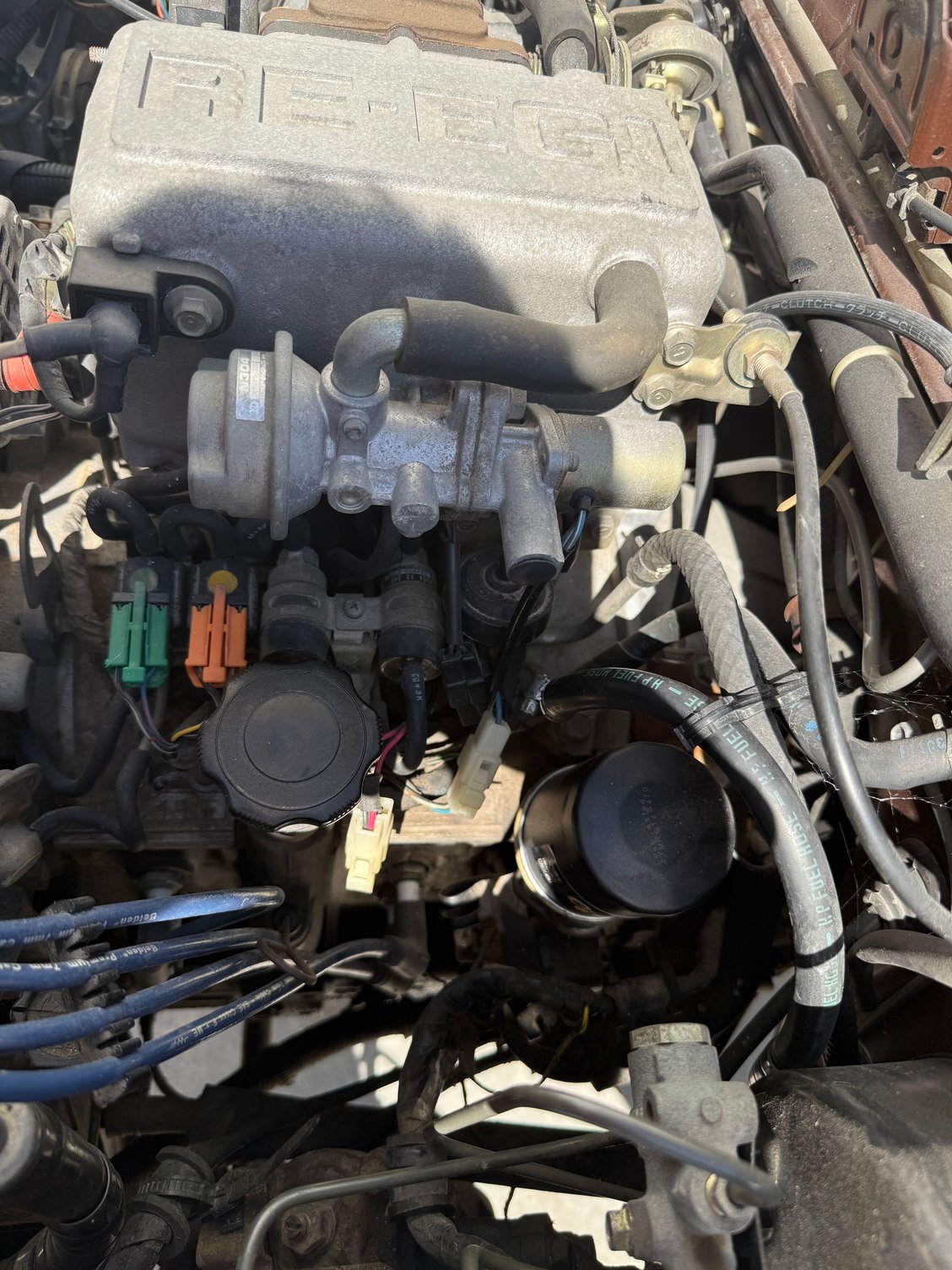 I really appreciate the guidance offered here. You guys are great! I had a little time this afternoon to work on the RX-7. I tested the fuel pressure at the supply line for the fuel rail. It’s looks good. That’s crazy considering the fuel pump didn’t move one bit when I first tried it out. Looks like it’s making 54psi. Next I put the whole injectors in the fuel rail and secured them in place with zip ties. After shorting the fuel pump plug I checked it for leaks. The pulse dampener was leaking a little from where the Phillips head screw was. Tightening that down stopped the leak. I let it sit pressurized for 30 minutes and the injectors didn’t leak. I’m still a little concerned about the fuel dampener leaking but I’ll check it again before I install the upper air intake. I quickly tested the injectors by pulsing them with 12v power and they each sprayed nicely. Getting the old upper air intake gasket material off the lower air intake was a pain! I got that off and called it a night. Tomorrow I’ll install the injectors and fuel rail and check it again for leaks before I replace the air plenum or “dynamic chamber”.