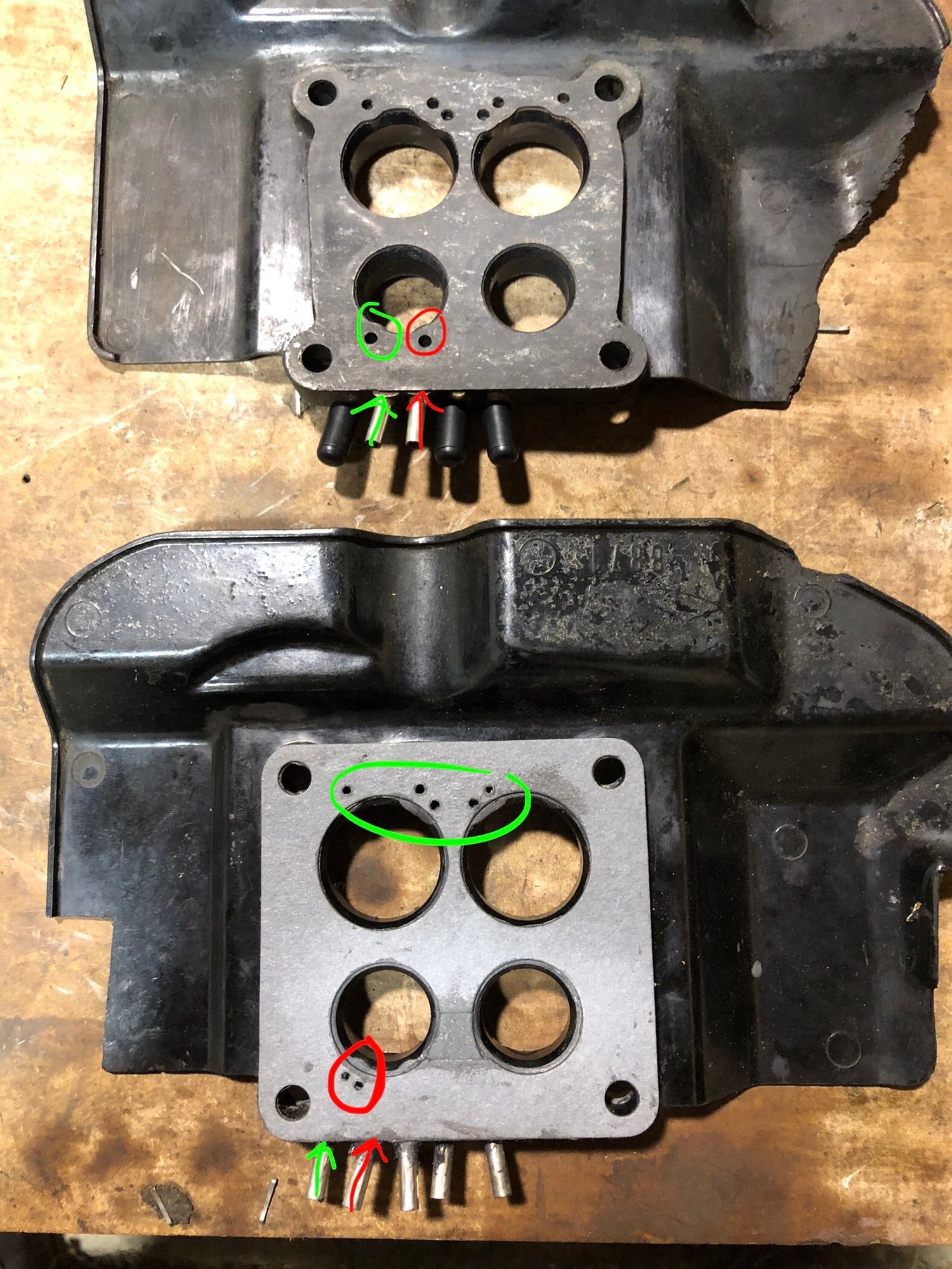 The two ports circled in red for the bottom plate (the at-one-time-‘79 and now-an-‘84 plate lol) both get air from the port neck with the red arrow, and the same thing goes for the green. I’ve circled the ports that I’m assuming give vacuum to the dizzy, but I’ve just been assuming that those are the ones.