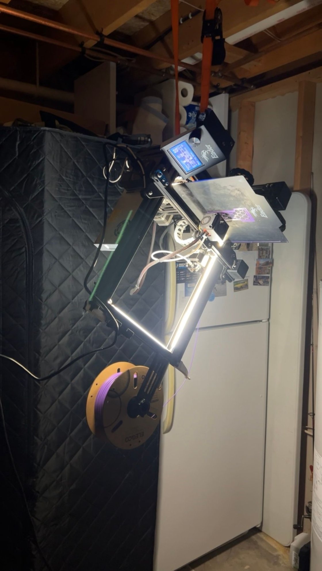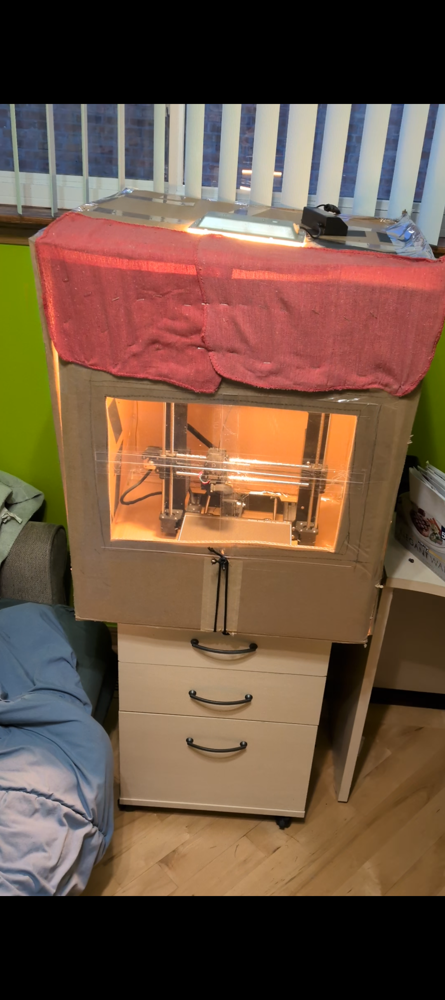 My choice of plastic is ASA which is highly UV resistant, decently strong, and not the worst material to print with the right tools. My current printer is a Prusa MK3S+ that I've semi-temporarily commandeered from my buddy and put in a horrible but incredibly cheap cardboard box enclosure along with a creality space pi filament drier.