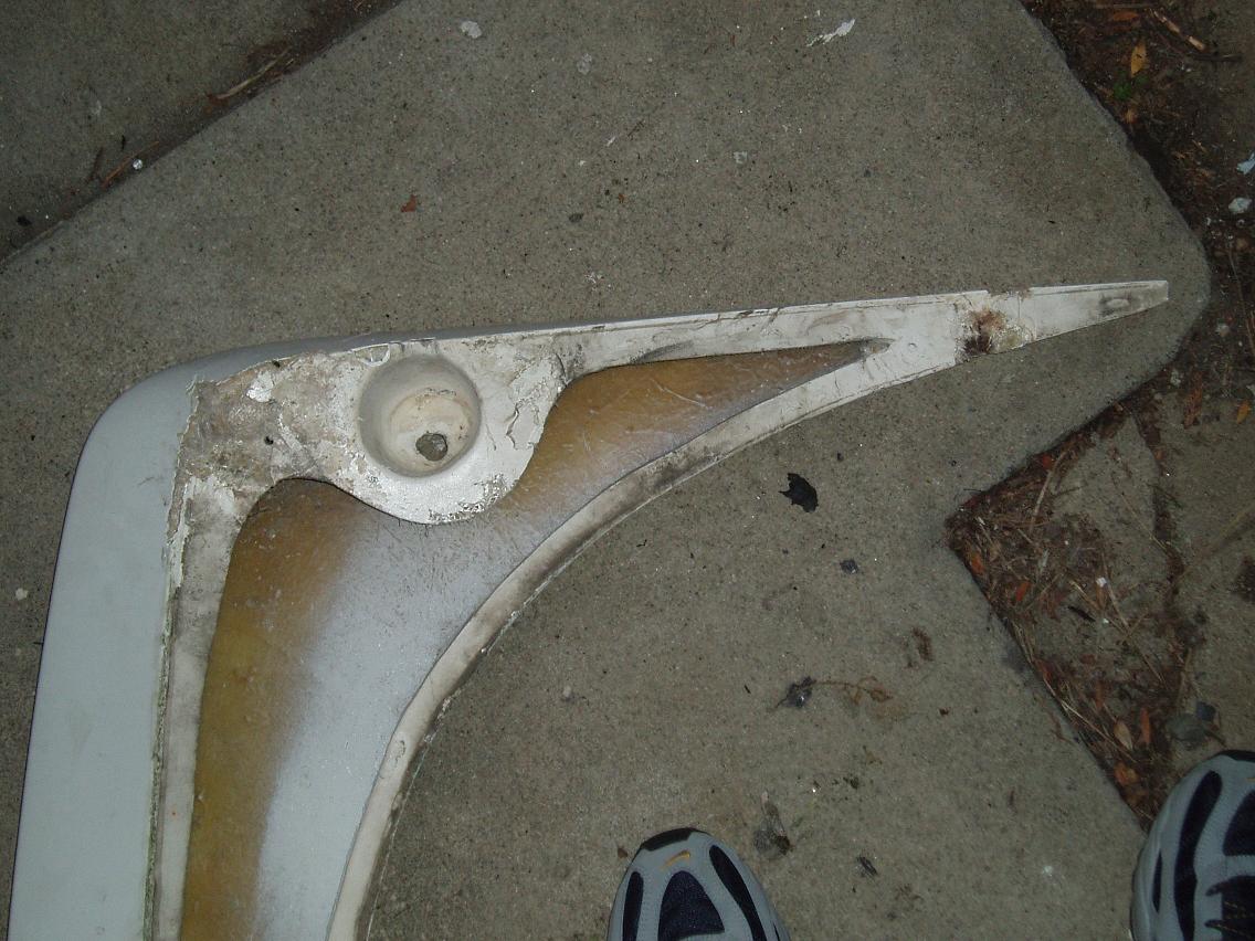 i pick up the wing t hat Steve posted about unfotunely the mounting bolts where hinding to where i couldnt really lotace them and on top of that there was plently of rust on the bolts also so i had to take extreme measures to get it off! after i got it off i saw where all the mount bolts where from the outside and if i didnt have a broke hand and sick wife at home i could have been able to do a better job getting it off, but with the limited resources that i have ie: broken hand i think it went pretty smoothly! here are the pics im going to use some resin and fiber to repair the wing the best that i can!
