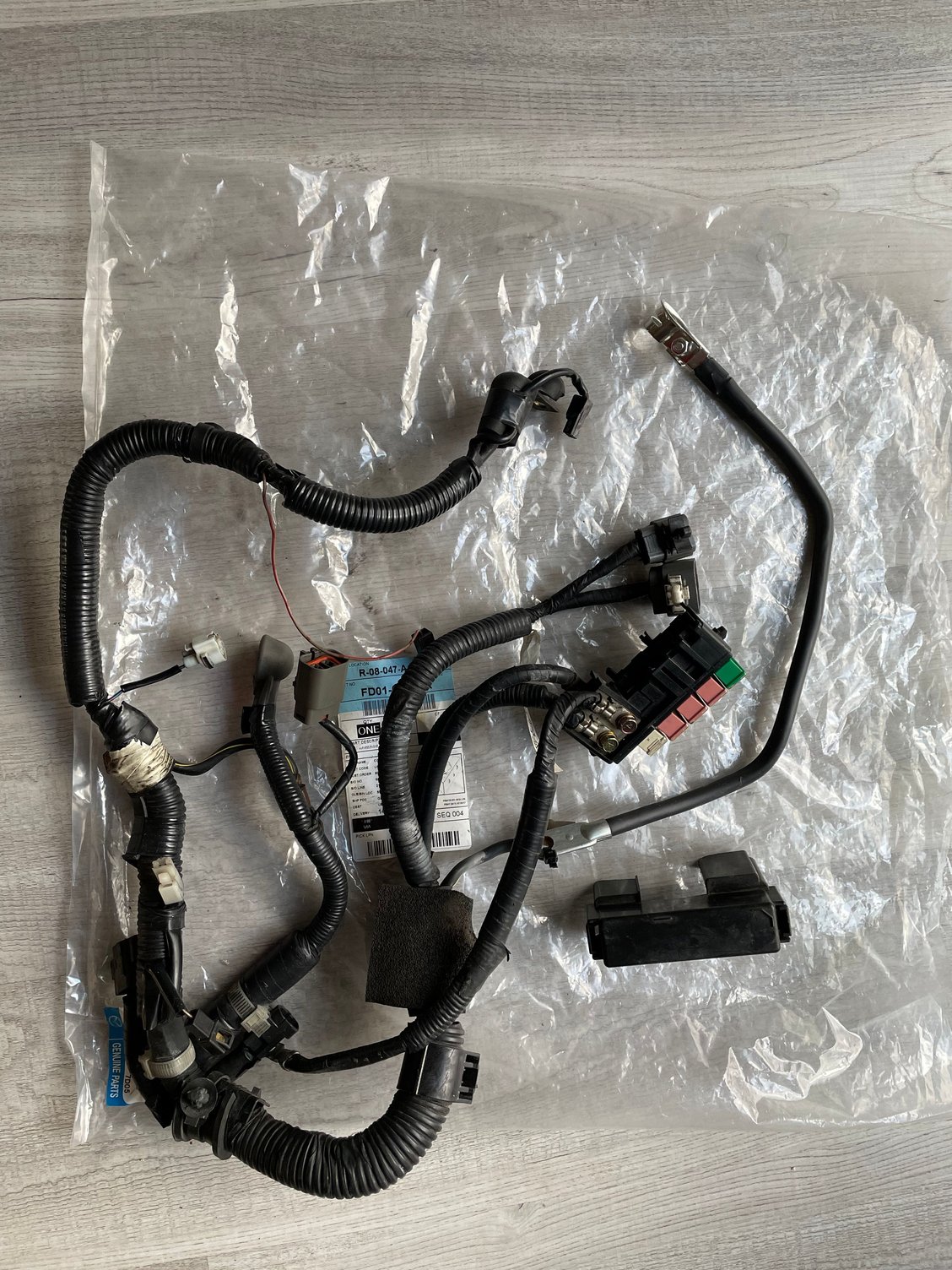 "Engine Harness" likely from a version 4 car. One connector cut off but remainder of wire is still there. Colour codes on wire could lead us back to identify which connector is clipped off.