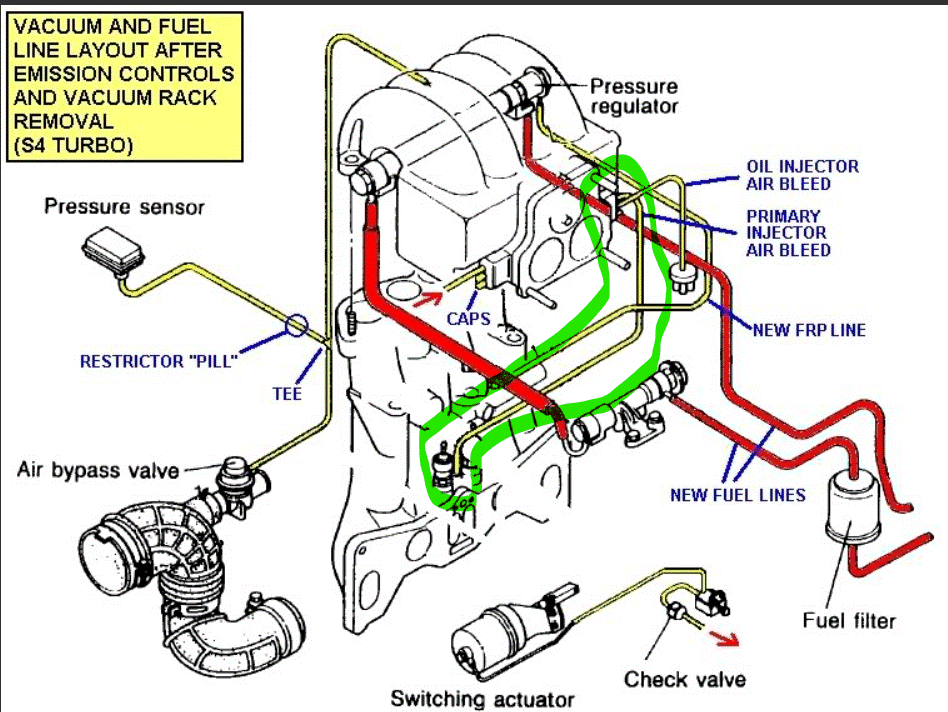 ok, so your talking about the line circled in green right? I remember hooking this line up when plugging the OMP injector right next to it. So, I would siphon from the end plugged into the back of the intake manifold, in front of the firewall to treat the front rotor..?