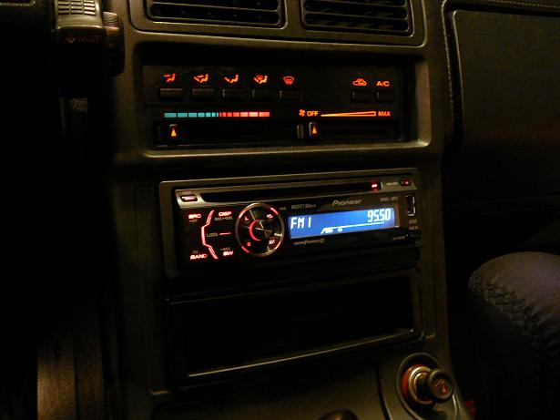 It's not shown yet in the last picture, but the DIN pocket was drilled to allow a stereo jack extension to be passed trough. The DEH-3050 has a standard audio in plug at the back and a USB at the front, so I needed to pass an audio extension from the back to the front of the console. That way the DIN pocket can hold my GF iPhone and the extension cable without any issue.