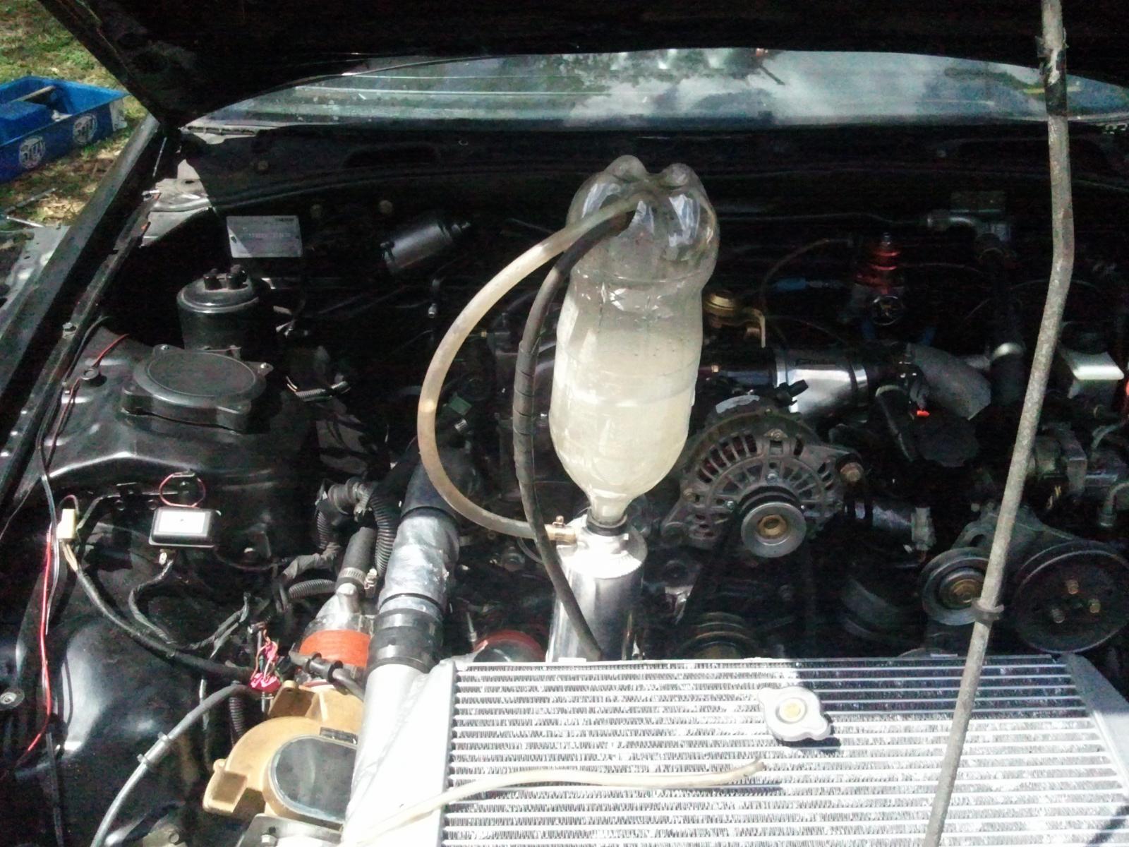 I put one tube of AlumAseal in the lower rad hose, blocked off the coolant feed/return to the turbo and ran it for 20 min or so, no die. The low coolant buzzer went off and shortly after it cut off and wouldn't re-start w/o pulling the egi fuse. Still no exhaust smell in the coolant or smoke/steam from the exhaust.