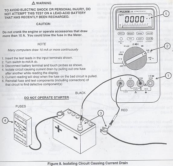 2 - Start pulling fuses, while monitoring the MM readings (start with the fuses at the engine bay, make sure you also test the main one 100amps that its hold by two 10mm bolts on each side).
