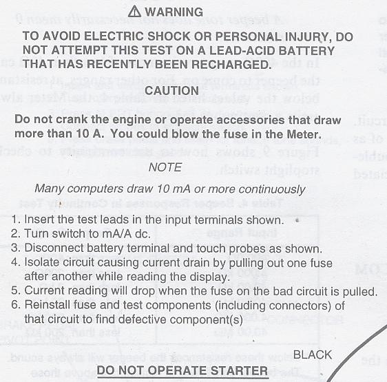 1 - Disconnect the negative side, and set the multimeter in siries between the battery post and the cable terminal.