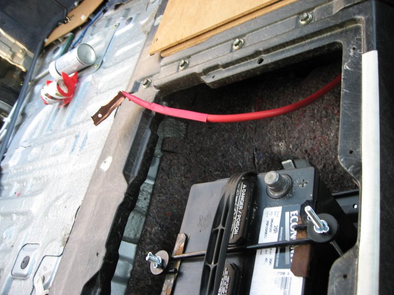 used a taylor battery relocation kit. buss 100 amp fuse(another location) couple pieces of ply custom bracketing for the bottom piece of ply. the top piece with the carpet is squeezed and beaten with a hammer slightly to get it to fit.
