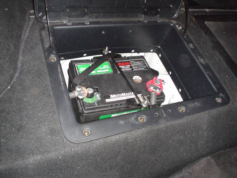 I should mention that I can pull on that strap as hard as I want, the battery isn't going anywhere. I used one of the stock holes for mounting, and drilled two more. I just used a nut/bolt/washers combo through the floor. Probably not strong enough to lift the car up or anything but definatly strong enough to hold the battery in case of an accident or whatever.