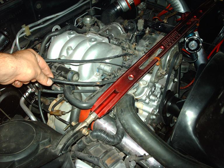 Here is the throttle cable. It goes aorund THE ENGINE not the tranny. On both pics you see it going around the engine. I used my strut tower bar for the middle part to hold it in place.