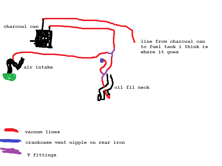 I just looked at your diagram hahaha making it way to complicated friend. The whole point of T-ing a line from the crankcase into the intake was to burn off the access. Running it too the charcoal canister I don't believe will do anything. What I'm saying is it would just be simpler running it to the ground with a filter on it than welding a nipple on your intake to vent it back into the system to be burned off.