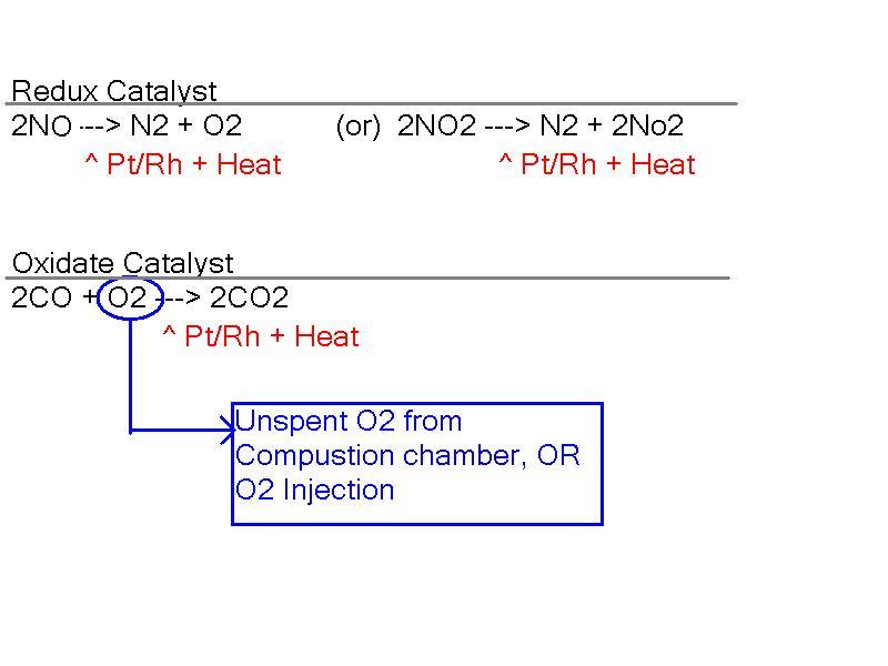Anyhow the reduction catalist is something like 2NO --> 2N + O2, or 2NO2--> N2 + O2. Catalist is generaly platinum, rhobidium, or a mix of both.