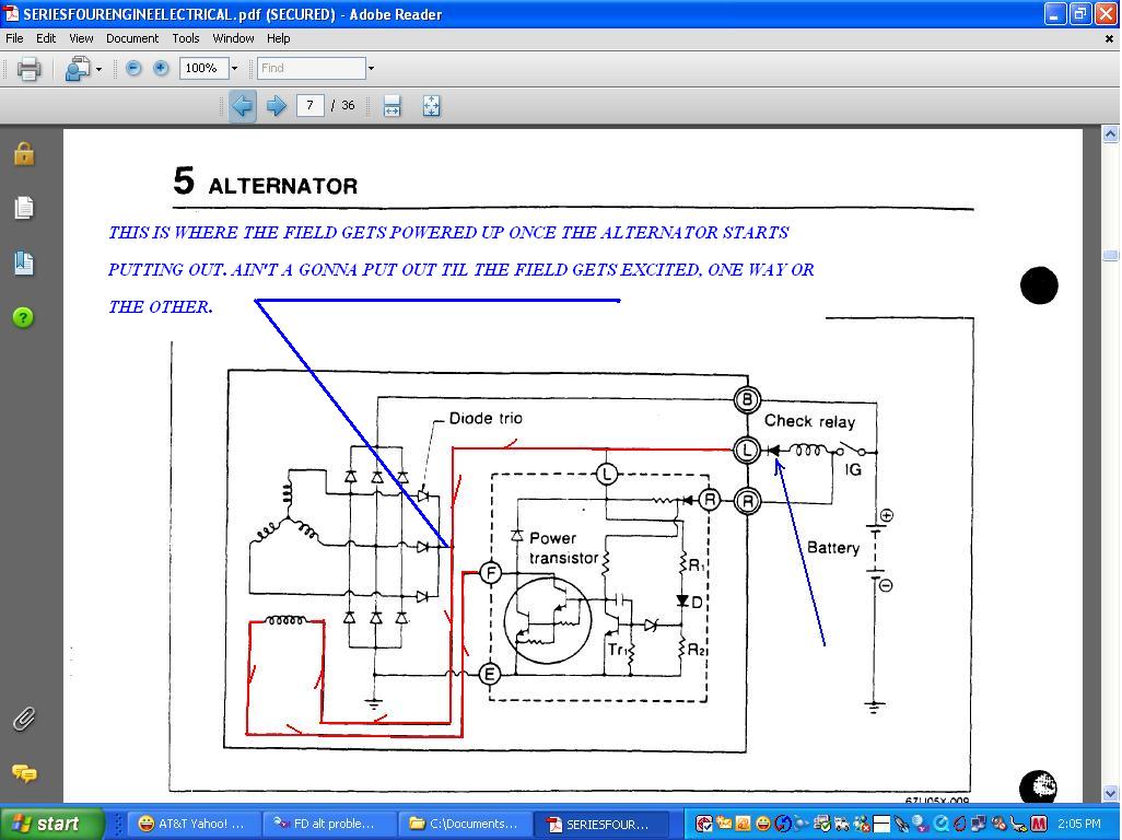 The fourth jpg is out of our FSM. It is not exactly the same as his, but functions the same. The L voltage enters the alternator....passes thru the field (rotor) ....goes to the regulator where it passes thru a transistor and then goes to gnd. That's the excitation voltage. When the voltage is up to par, that transistor is *shut off* and the alternator isn't charging anymore. It flip flops like that quite a bit evidently.