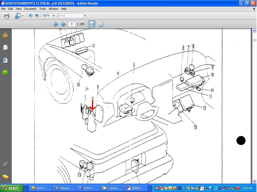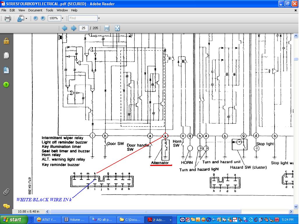 The WHITE/BLACK wire should be in the upper plug. ON the top row of the upper plug. And as shown in the jpg, it's the fourth wire over from the left. Top row. Drag that dead *** CPU out of it's location but leave the connectors on it. That gives you room to put a piece of wire/paper clip/something up it backside and then put a meter on that paper clip and see if there is batt volgage there or not. I'm sure there is.