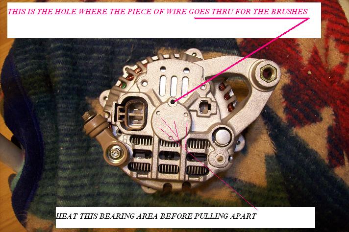 Then look at the picture in the FSM and use a common screw driver to seperate the two large parts of the alternator. Persnonally I have to strike the two EARS with a hammer judiciously to seperate the two halves.