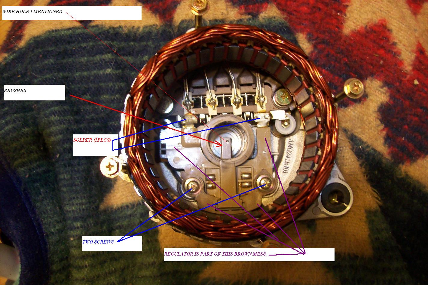 You need a soldering iron to do the rest. I had one that had a sharp tip on it. I just ground the tip flat with a Mikita grinder to give it more area. Hold the iron against the twp places the regulator is soldered in ...one at a time til the solder melts and you can lift up that area. Then do the other soldering place. Remove the regulator/brushes. Install the new regulator. Oh, I forgot the two screws that also hold the regulator/brushes in.
