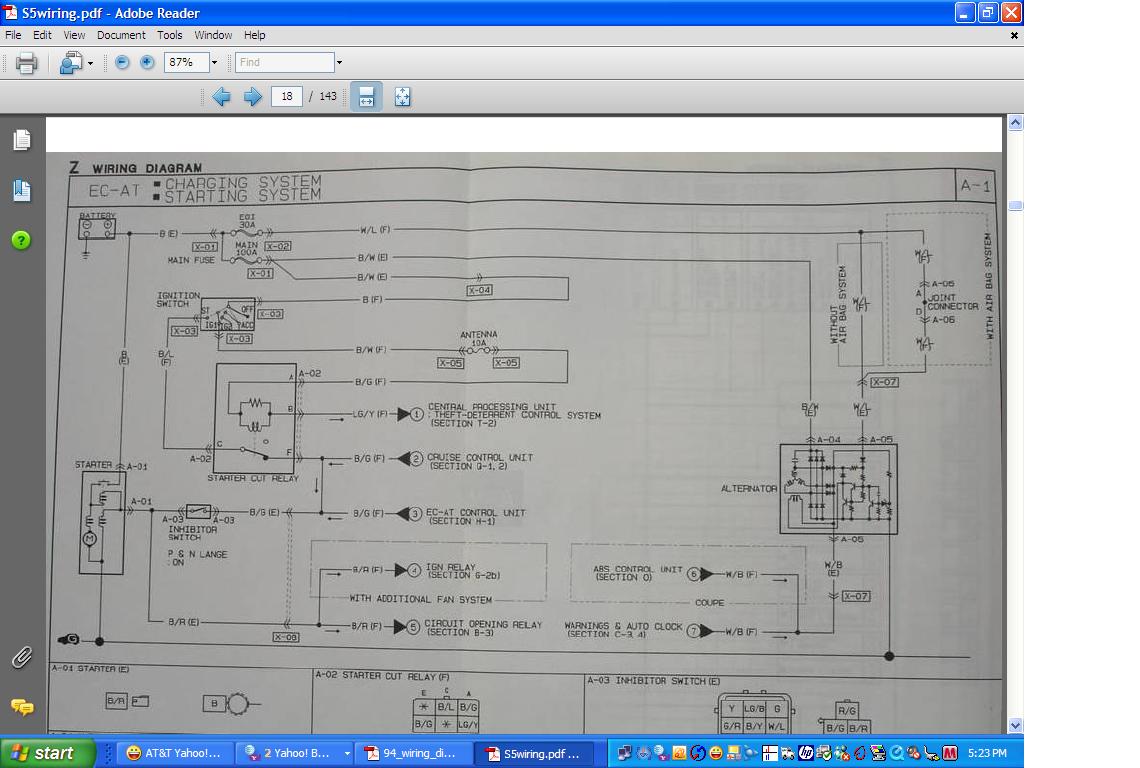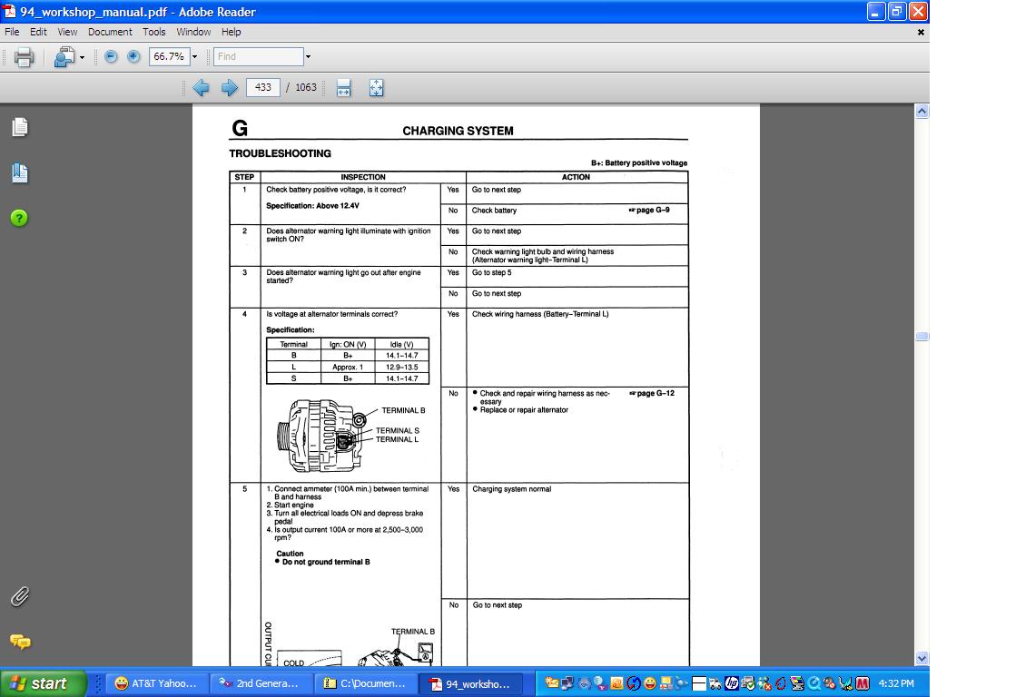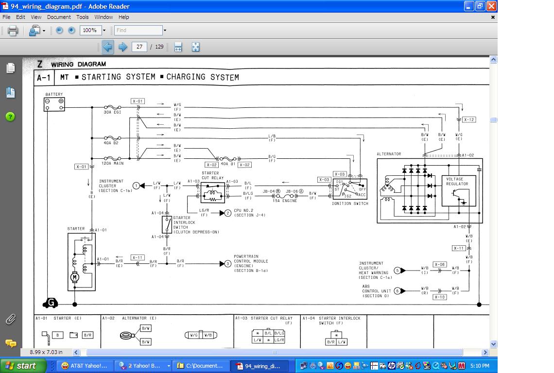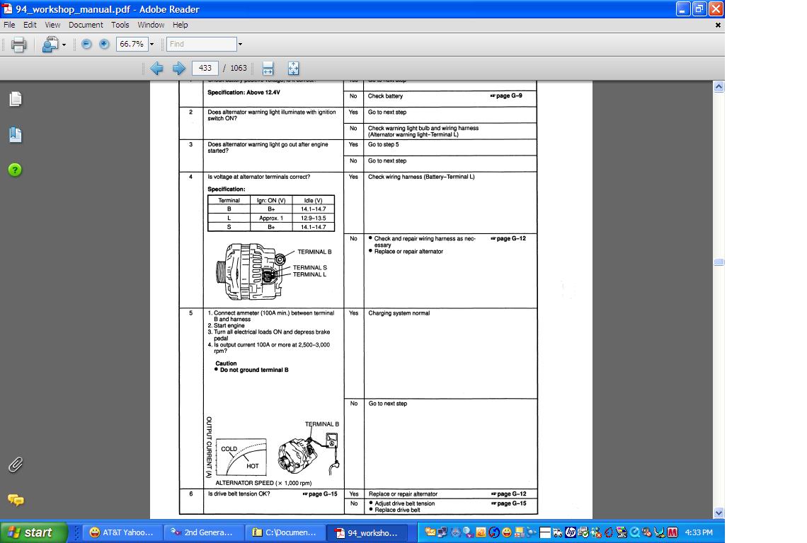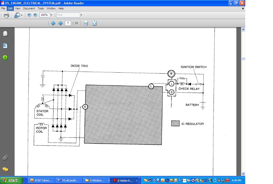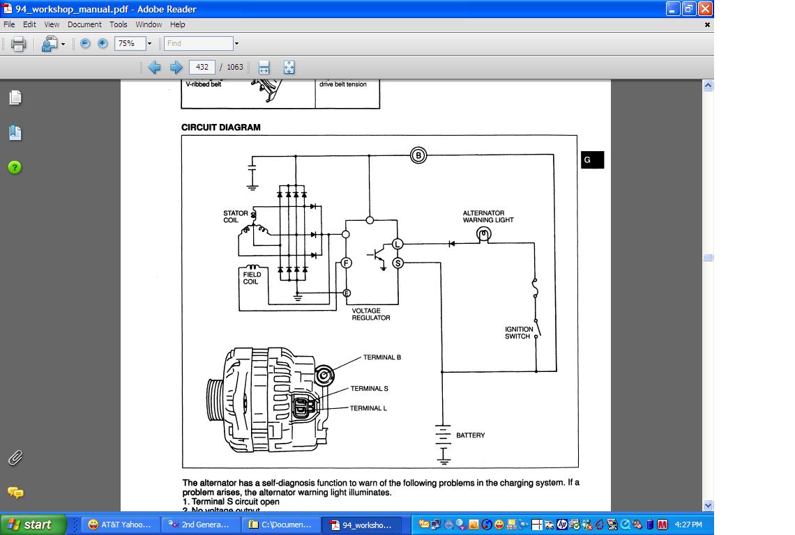 "The half *** Mazda Warning Light cluster really does not matter all that much since it's a known defective part that needs repair tooooo much on tooooo many car. The L wire on a series four goes to a relays coil in the CPU. Here's what you do. Turn the key ON with the white/black wire off the alternator. See if the black/white wire has approx batt voltage on it. Say YES IT DOES!"