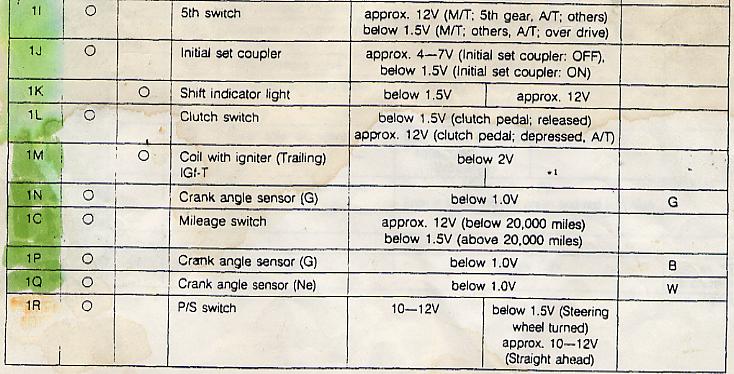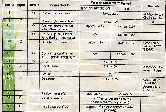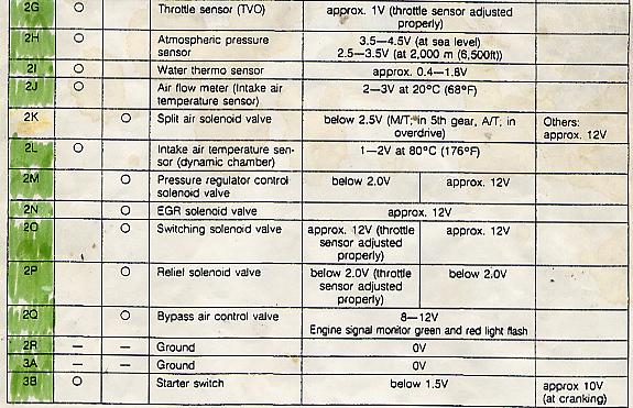 If 2A has what you said earlier, .4vdc, then you need to wonder what it was that blew the output device in the ECU. Pin 2A feeds several things. The TPS, AFM, ATP, BOOST SENSOR, VARIABLE RESISTOR. Maybe a dead short on one of those wires?