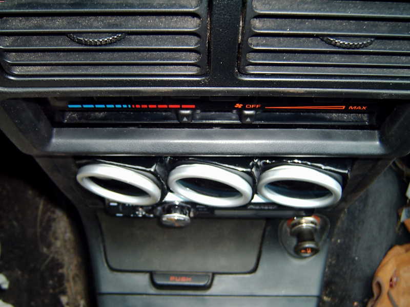 i was thinking about this last year. wondering where and how i was gonna put my gauges. i realised that if you mount them in the center console in the second din spot they usually face straight back. so i made this, the gauges are tilted towards the driver and the surrounds are rotor shaped.