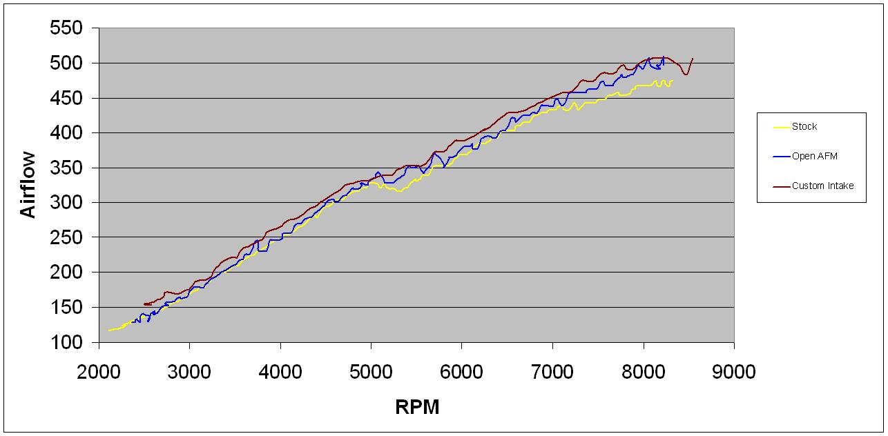 This is phenomenal data. Not sure why it took 25 years to get airbox flow info, but keep it up. A turbo must have absolutely abysmal airbox losses. If the engine consumes more air, then the power must increase accordingly (as long as you have sufficient fuel). You should expect to see about an 8% increase in peak horsepower.