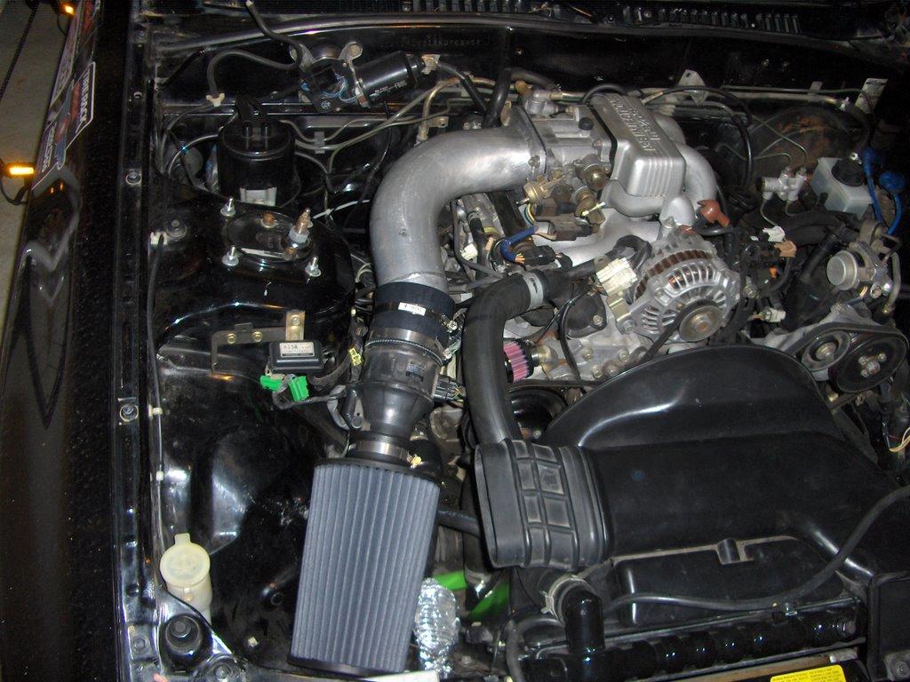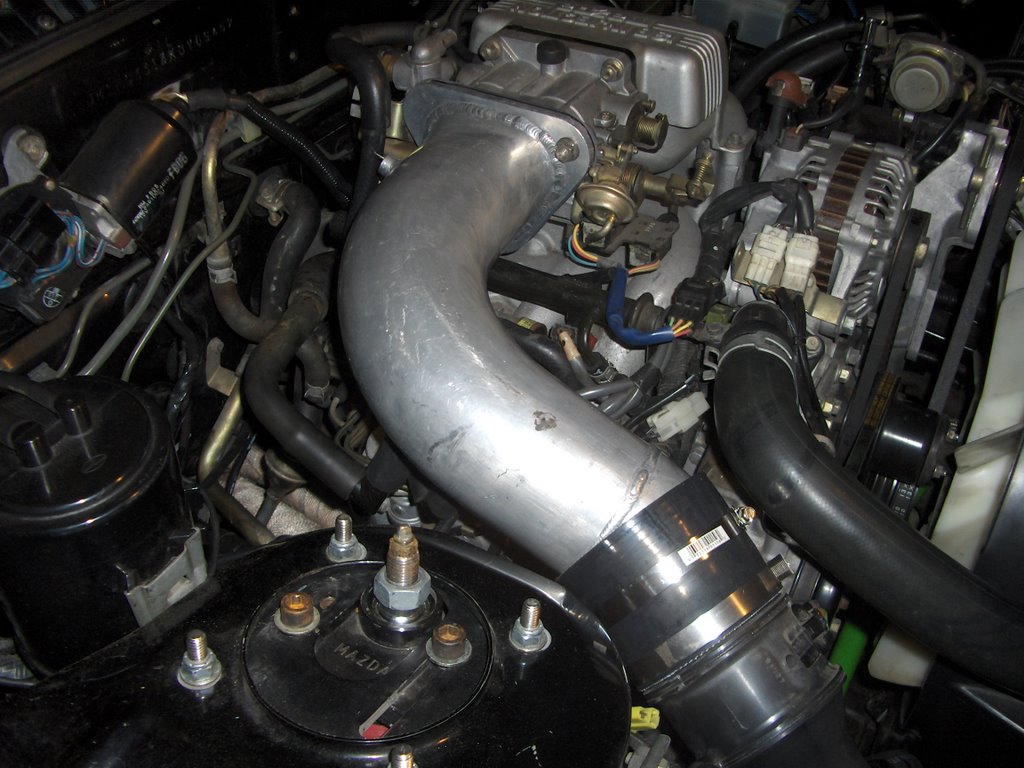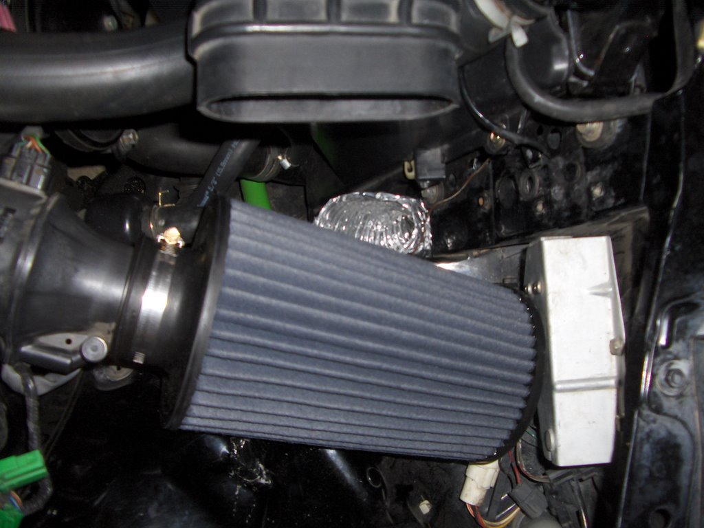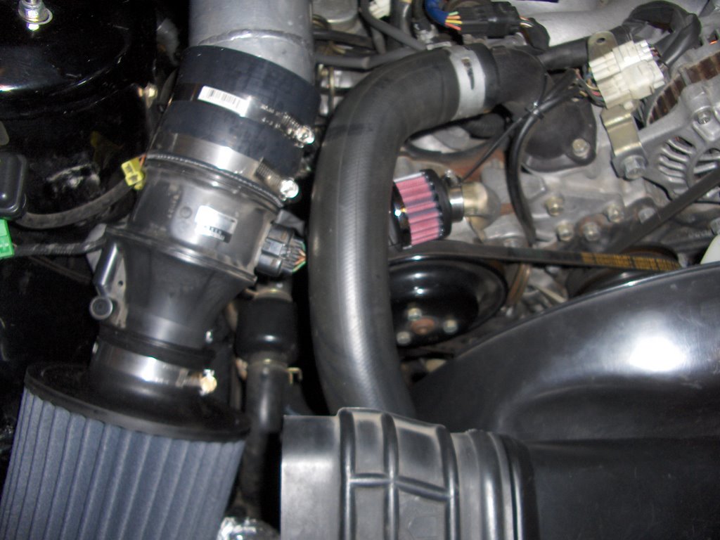 Finally, I decided to use the custom aluminum 3.5", smooth bore intake tube that I picked up from a race shop. It was originally made for a race car that used a custom airbox where the passenger's headlight would be, so it needed a lot of modification to work with the stock AFM. It had no connections for the BAC or the crank vent tube, so I fabbed connections for those. I picked up a 3.5" silicone coupler to connect the AFM, and the biggest high flow filter I could find. It's an AEM dryflow, 6" diameter and about 10" long.