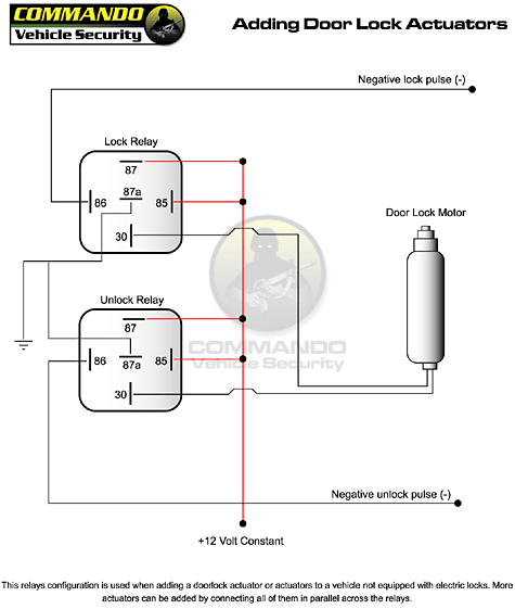 If the keyless control brain doesn't have built in relay's you'll use two relays (one for lock and one for unlock). You would wire the relays as follows: