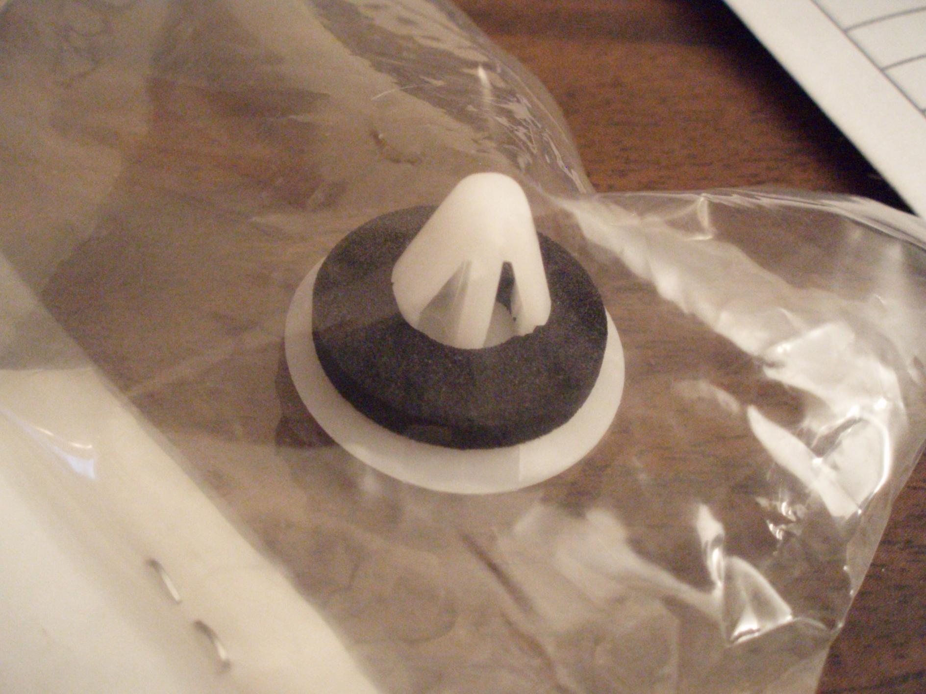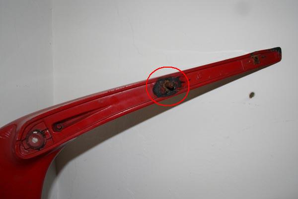 (B) Then you have the two plastic fasteners in the rear corners of the spoiler from the photos I posted above. These twist and lock into a metal collar that is embedded in the spoiler itself. The other side snaps into a blank hole in the body. There is no corresponding collar or other hardware on the body of the car, just a bare hole.