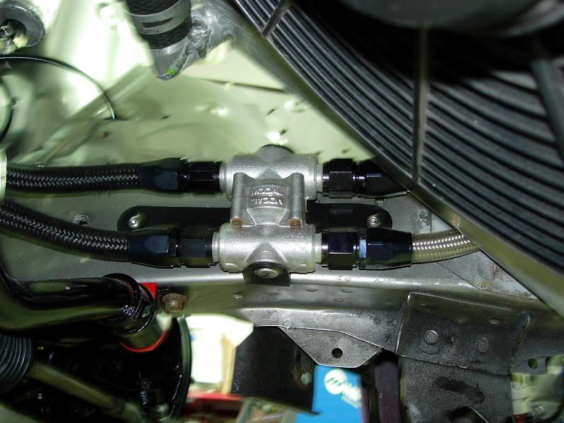 Decent shot of both coolers and the associated plumbing. Yes they are in series & I have my reasons. You can see the red caps on the Mocal Oil T-stat. In the first iteration I was short 2 90*s. I ended up using straits, couplets & 90's