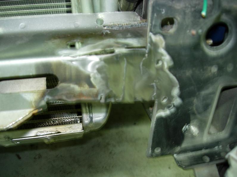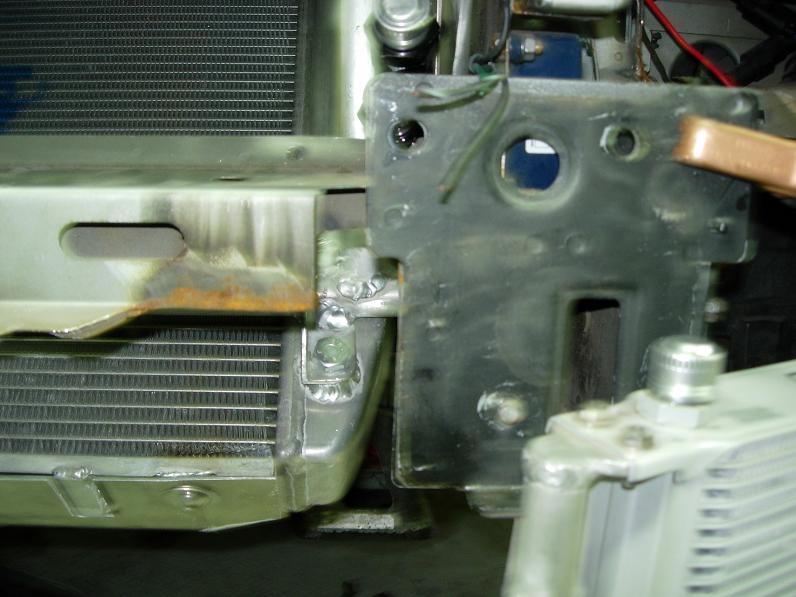 So after a whole bunch of time measuring and remeasuring and double checking my re-measureing I welded a tab onto the outer bracket and bolted it in place. At this point I'm making sure the cooler is nice & level and tacking on the other tab. The inner bracket bolts to the bottom of the framerail while the outter bolts to the feder support.