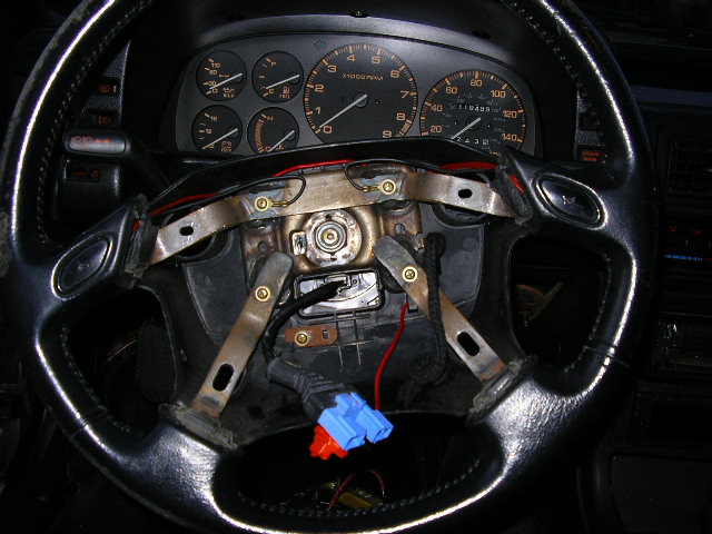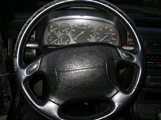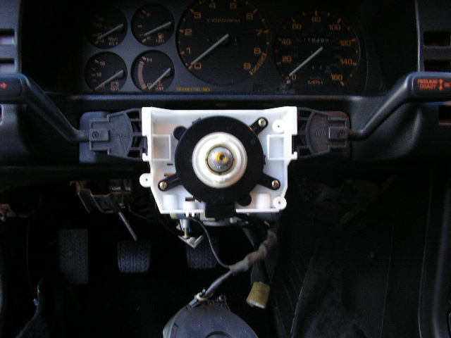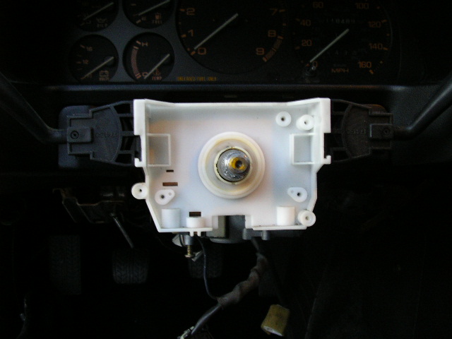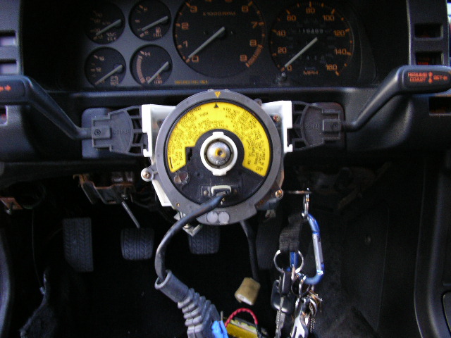 I have a 1991 May build RX-7 convertible. The car is equipped with an airbag. My car gives me the 5 beep warning code. It use to just beep when it was driven in the rain. Then it started beeping the 5 beep code non-stop. Later it progressed into beeping only when the ignition is first turned on and then about once every hour. I have included pictures of the breakdown of the wheel so you can see for yourself. What I thought was the steering angle sensor I now believe is the turn signal cancel switch. I have no idea where the sensor is! The final picture of the column shows the white piece but this seems to be just solid plastic that holds the stalks. The first piece removed is a clock spring and it is for the horn and airbag. Can anybody help me?