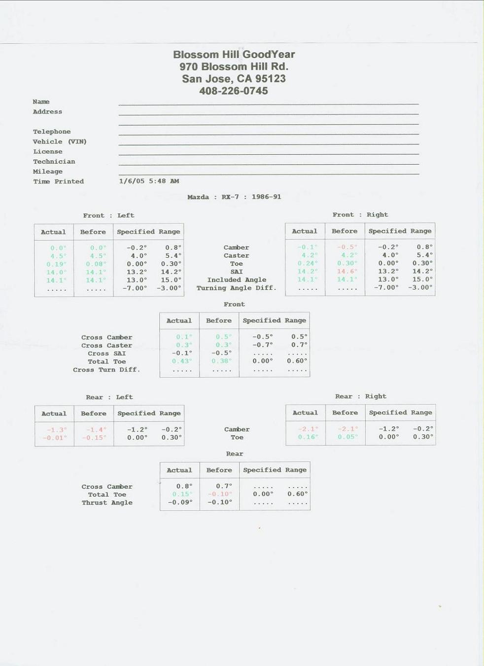 You guys are gunna love this. So I take the car to my mechanic to make sure nothing is bent/broken and he looks at the car and tells me nothing was done to the car. THE ******* DIDN'T DO **** TO ALLIGN MY CAR! Not 1 bolt was moved, loosened, changed nothing. Went down the street to Firestone and they aligned the car and now the thing is perfect! I'll try and scan the NEW sheet with specs tonight and post it. I'm so pissed. So for everyone who lives in California. NEVER GO TO SKIP'S/GOODYEAR TIRE SHOPS!!!!