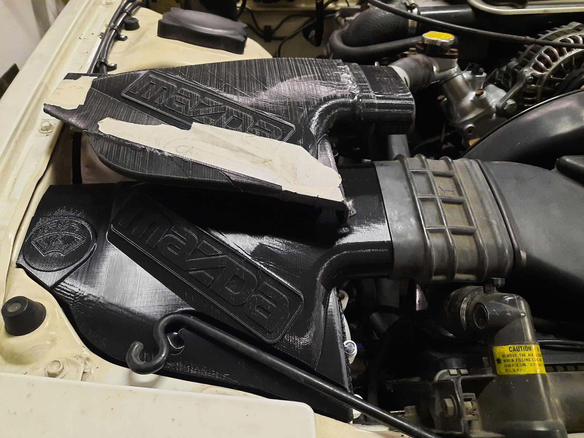 So I originally had the parts printed in PETG plastic, but I was concerned about the temperature capabilities and whether or not it could withstand the high under hood temperatures. After some research, I settled on using either ABS or ASA due to them being listed as high temp capable. There are other higher temp capable plastics (glass reinforced Nylon for example), but I don't have access to a printer that can make parts as big as what I need. I ran this by one of my coworkers who specializes in plastics, and he thought that I would be ok with the ASA material that I settled on. I showed him pictures of the engine bay, and he pointed out that the snorkel connected to the intake to is blow molded. The vast vast majority of blow molded parts used in the automotive industry are made out of High Density PolyEthylene (HDPE). This is because it is the cheapest to mass produce (in comparison to other materials). It is also used, almost exclusively, to make semi-transparent blow molded coolant reservoirs as well and ours sit in the general vicinity of the snorkel. ASA has a higher continuous service temperature than HDPE (100C vs 85C). Unlike HDPE, ASA doesn't melt but softens at its Glass Transition Temperature (up to 110C) while the melting temperature for HDPE is 120C.