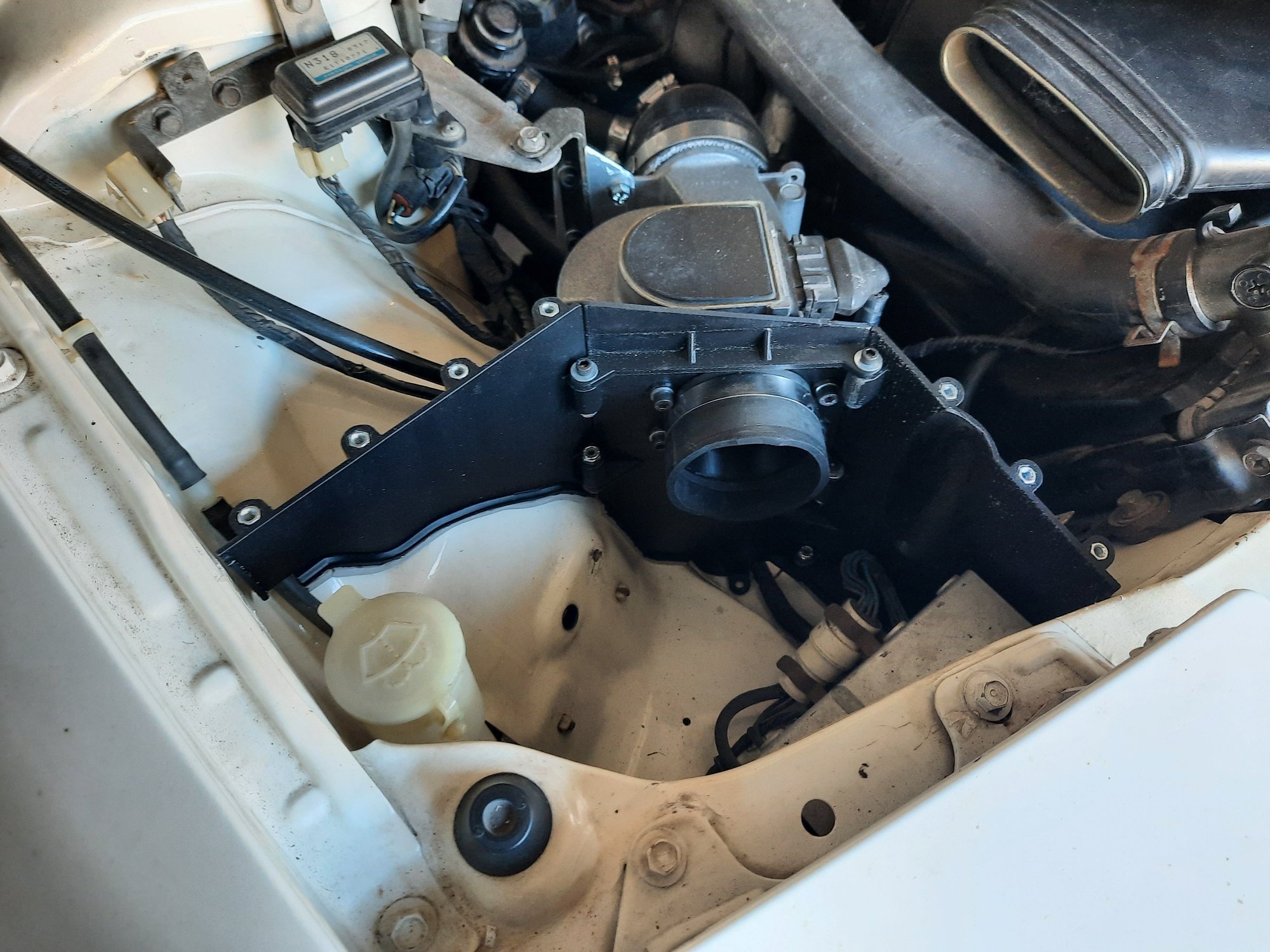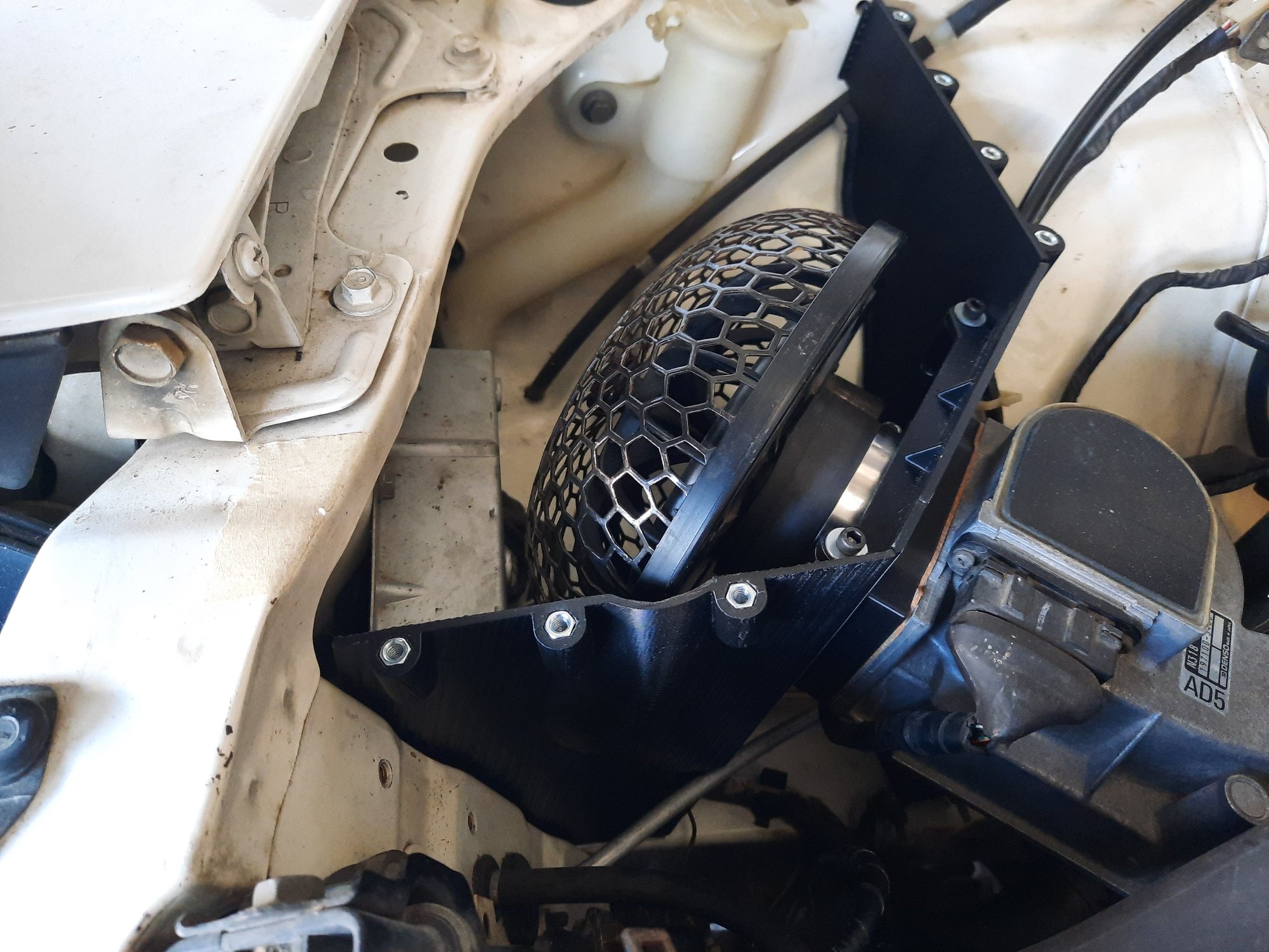 This is designed for use with an HKS intake (as shown) but I did play around with some other options that were mentioned on here in other posts (specifically the AEM dryflow). The pieces were printed in ASA plastic due to that material's ability to handle high temps. I used coupling nuts and mostly stainless hardware from Menards to join the pieces together. The silver was painted with aluminum colored high heat paint from O'Reilly's.