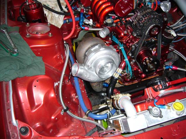 Just took this picture yesterday and thought it was neat. I was mocking up the wastegate runners. GT4088R on a custom 2" SCH10 stainless manifold that I made to fit the 6 port block with NA lower intake, Tial 44MM wastegate, 3.5" SCH10 (thick but quiet!) stainless downpipe. Still need to finish weld the wastegate runners and plumb the wastegate dump into the downpipe.