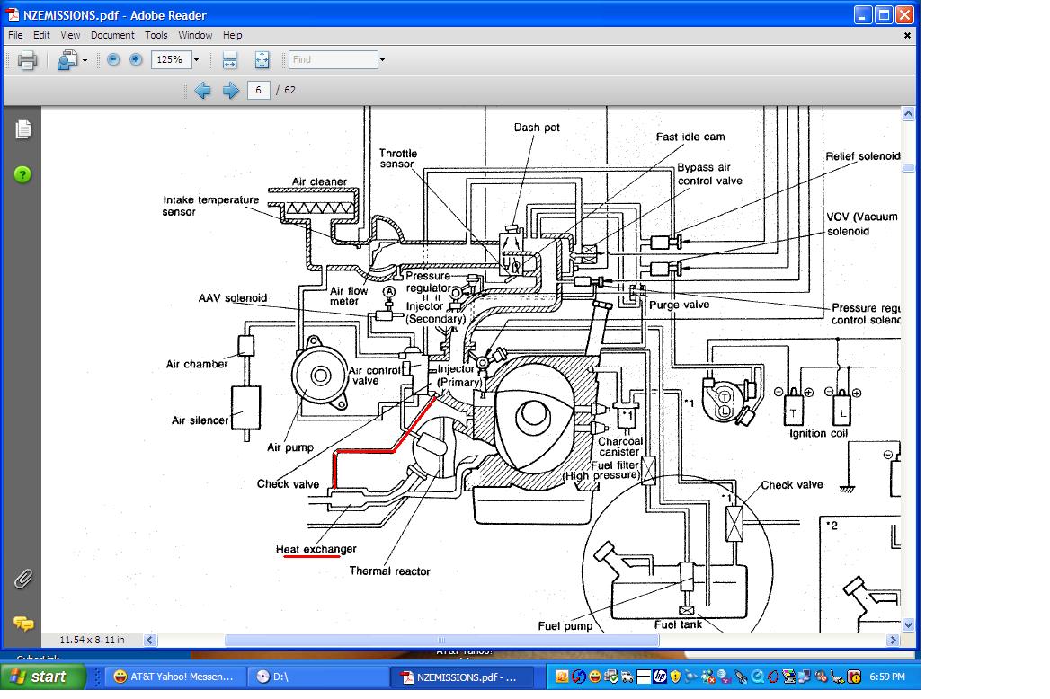 Seeing as how you have a Air Control Valve, It makes me believe that the pipe connected to the heat exchanger apes what the USA versions do, it dumps air out that pipe when the ACV selects that passage. On a USA version, the air from the airpump goes to the ACV. That air is then sent to the exhaust PORTS. The exhaust ports being where the mulitport inserts are located. About two inches from where the engine and exhaust manifold meet eachother. It mixes that fresh airpump air with the exhaust gasses coming out the engine. It does that so the afr will be closer to 14.7 prior to getting to the catalytic converter. There's honoraboe mention in that Training Manual that the catalytic converter works best when the gases going into it are in the 14.7 afr range.