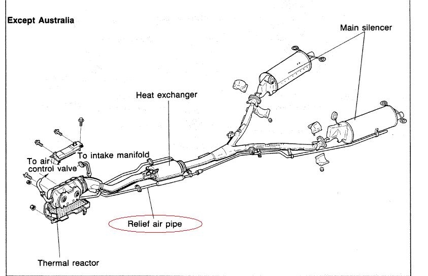 "Simple" EGR system of my Rx-7.....For Austraila model..ECU controls the amount of exhaust gas that is injected to the intake manifold...For my Rx-7, maybe ECU does not control that...the amount of exhaust gas injected to the intake manifold is regulated by Relief Air Pipe(the pipe beside the main silencer)...i think thats why no Relief Air Pipe is in Australia model....am i right??