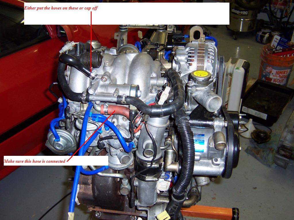 Or on the back of the turbo inlet duct go two hoses. Make sure there are no open holes on the turbo inlet duct. Also make sure the turbo inlet duct is attached to the turbo and there are no cracks where the duct mates with the turbo.
